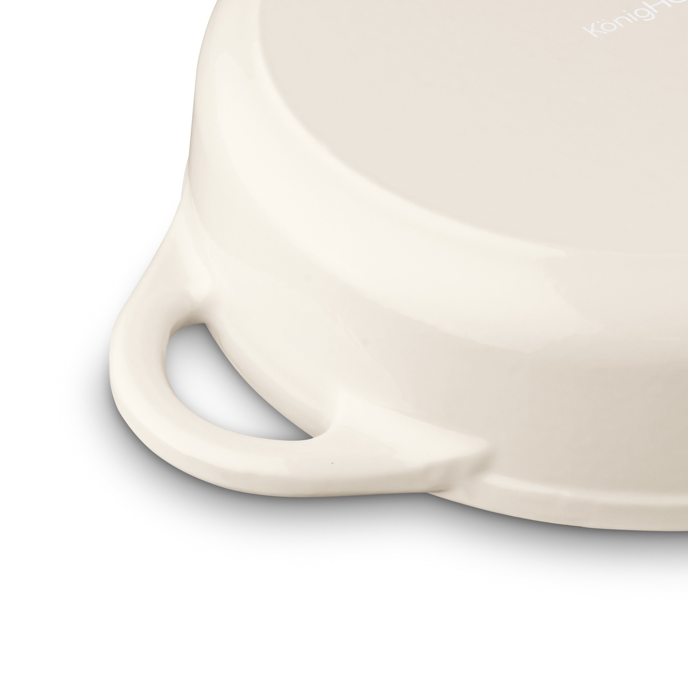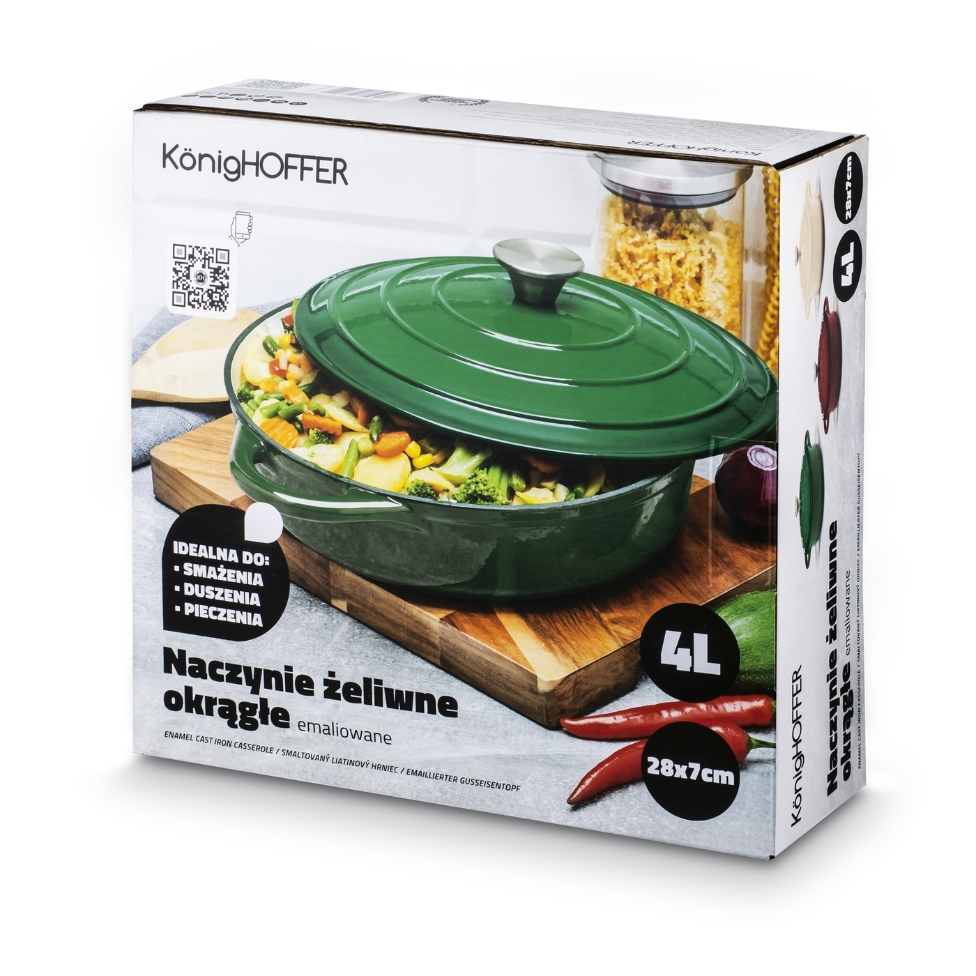 Stworzysz w niej kompozycje smaków, które wymagają czasu i cierpliwości. Użyte składniki będą chronione przed przywieraniem, gdyż wnętrze tej okrągłej brytfanny Konighoffer pokryto nietoksyczną EMALIĄ. Naczynie z taką powłoką, poleca się dla alergików, osób starszych oraz do tworzenia potraw dla dzieci.