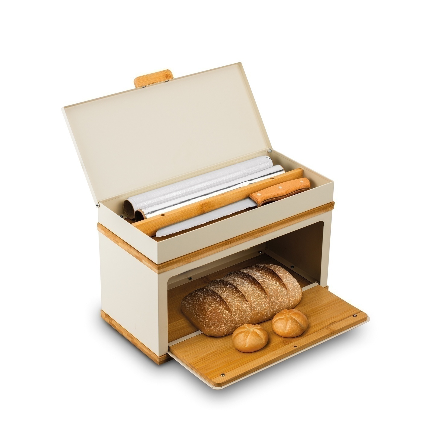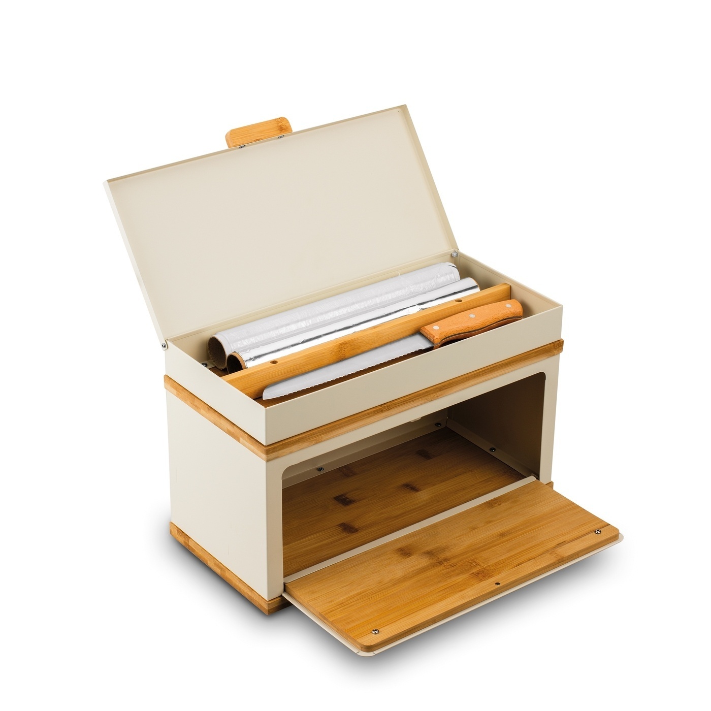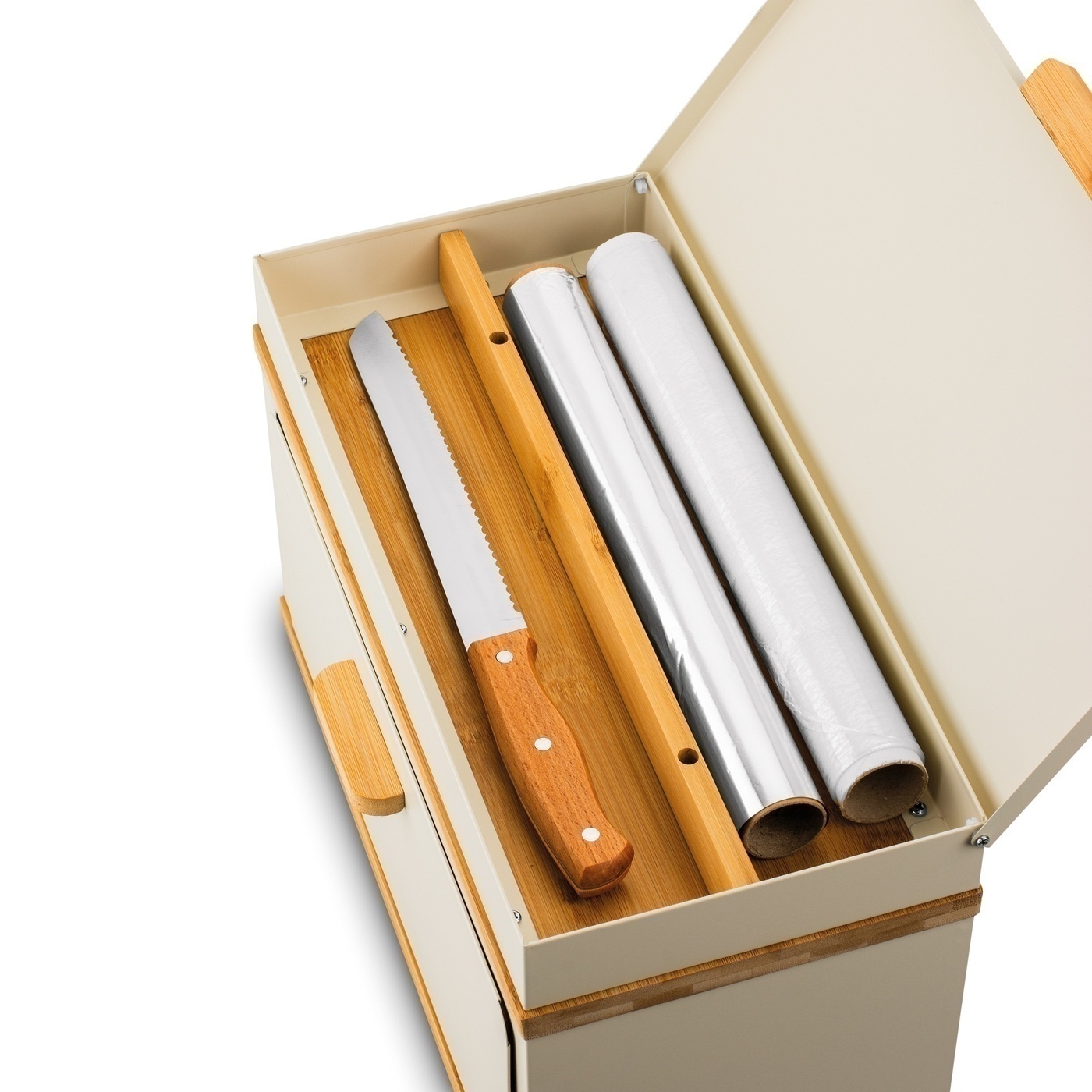 Dodatkowym atutem modelu Artesano jest wygodny schowek umieszczony w górnej części chlebaka. Umożliwia on przechowywanie folii aluminiowej, folii spożywczej lub papieru śniadaniowego. Wymiary przegród 8,5 x 37 x 4 cm oraz 8 x 37 x 4 cm zapewniają wygodny dostęp do akcesoriów kuchennych, jednocześnie pomagając utrzymać porządek na blacie.