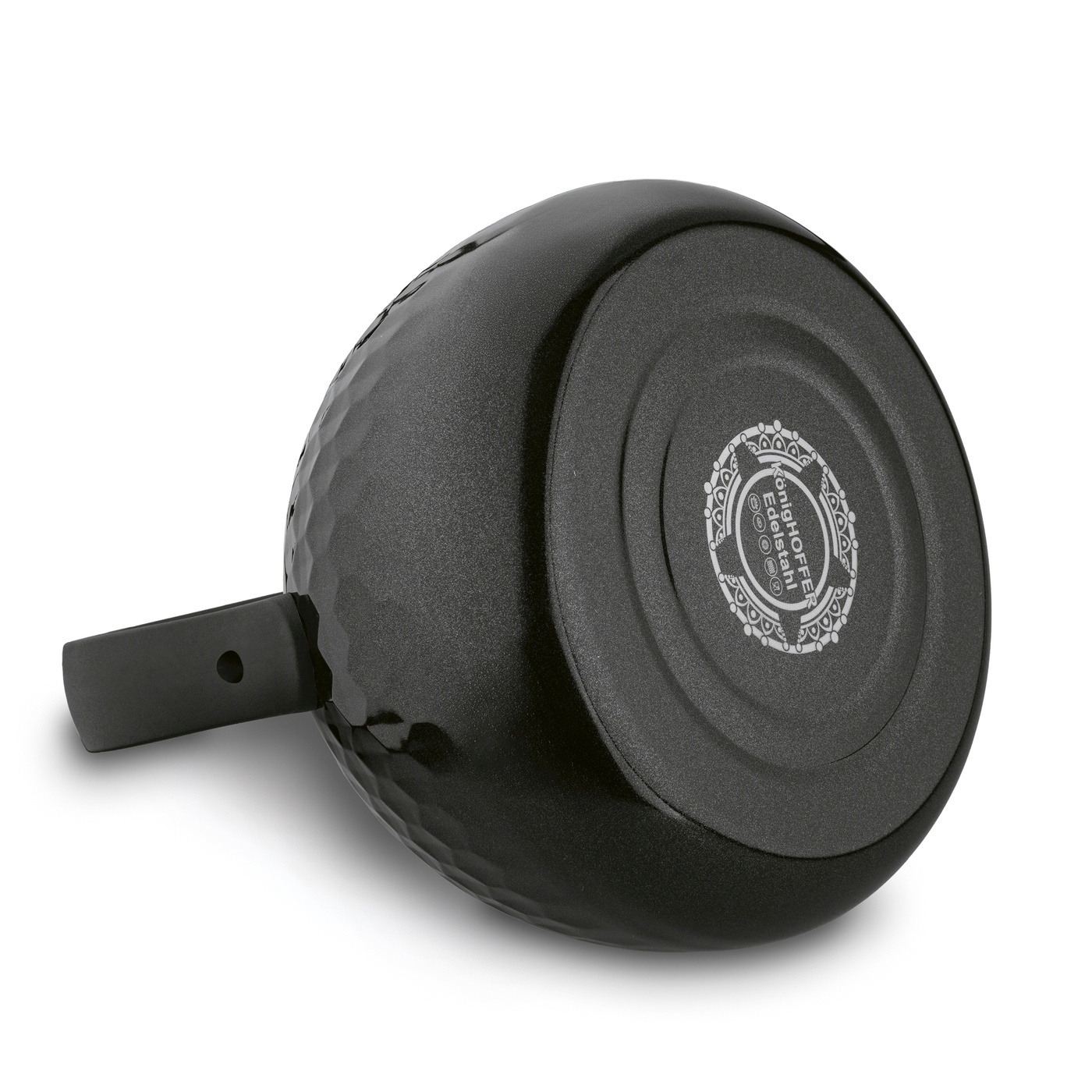 Na czas przypomnisz sobie także o gotującej się wodzie. Czajnik tradycyjny Malcolm możesz ustawić na każdym rodzaju kuchenki - również na płycie indukcyjnej. Najważniejsze jednak, że jest pojemny. Z zewnątrz pokryto go proszkowo czarną, błyszczącą farbą. Symetryczne tłoczenie powierzchni zaczerpnięto z uporządkowania geometrii. Jego kształt zainspirowała natomiast natura (kropla rosy).