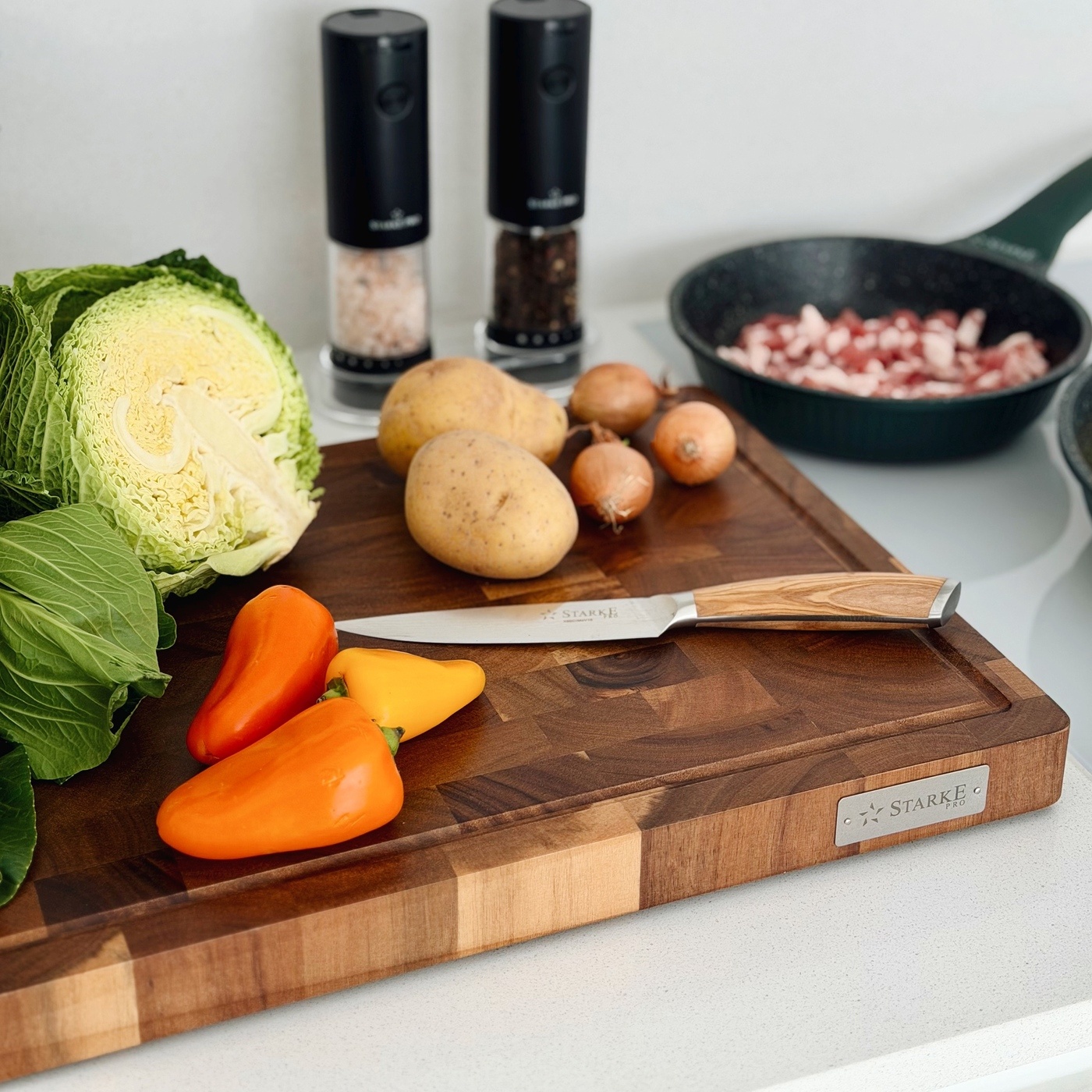 Deska do krojenia Starke Pro 40,6 x 28 x 3,5 cm ma nóżki ABS i żłobienie zapobiegające ściekaniu soków z krojonych składników. Stabilnie ustawisz oraz przeniesiesz wszystko, co się na niej zmieści. Doskonale łączy wysoką odporność na uszkodzenia mechaniczne z delikatnością dla twoich kuchennych noży. Z satysfakcją będziesz wspominać każdą okazję do jej użycia - to esencja stylu loftowego, rustykalnego oraz skandynawskiego!