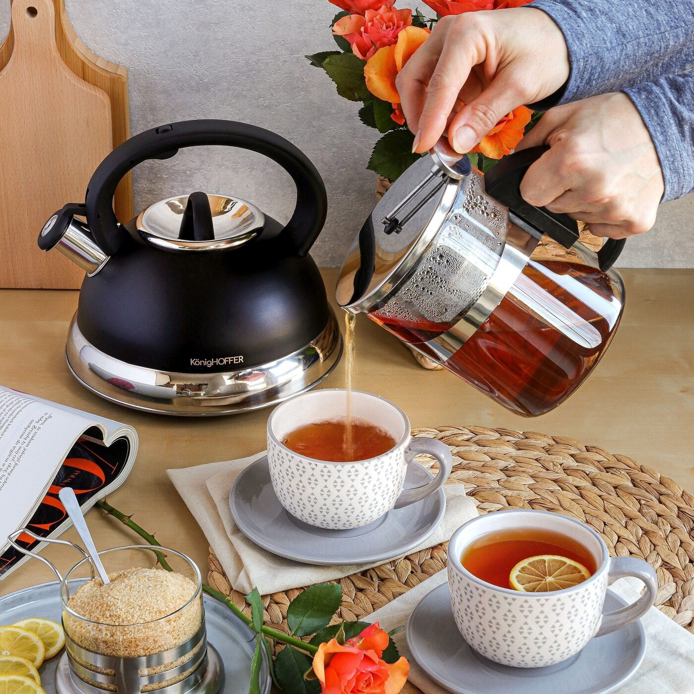 Ten zestaw do herbaty to praktyczne i eleganckie rozwiązanie dla osób, które cenią komfort parzenia oraz estetyczne podanie napojów. Dzbanek Konighoffer Saphir wykonano z przezroczystego szkła , odpornego na wysoką temperaturę, co pozwala bezpiecznie przygotować gorącą herbatę lub napary ziołowe.