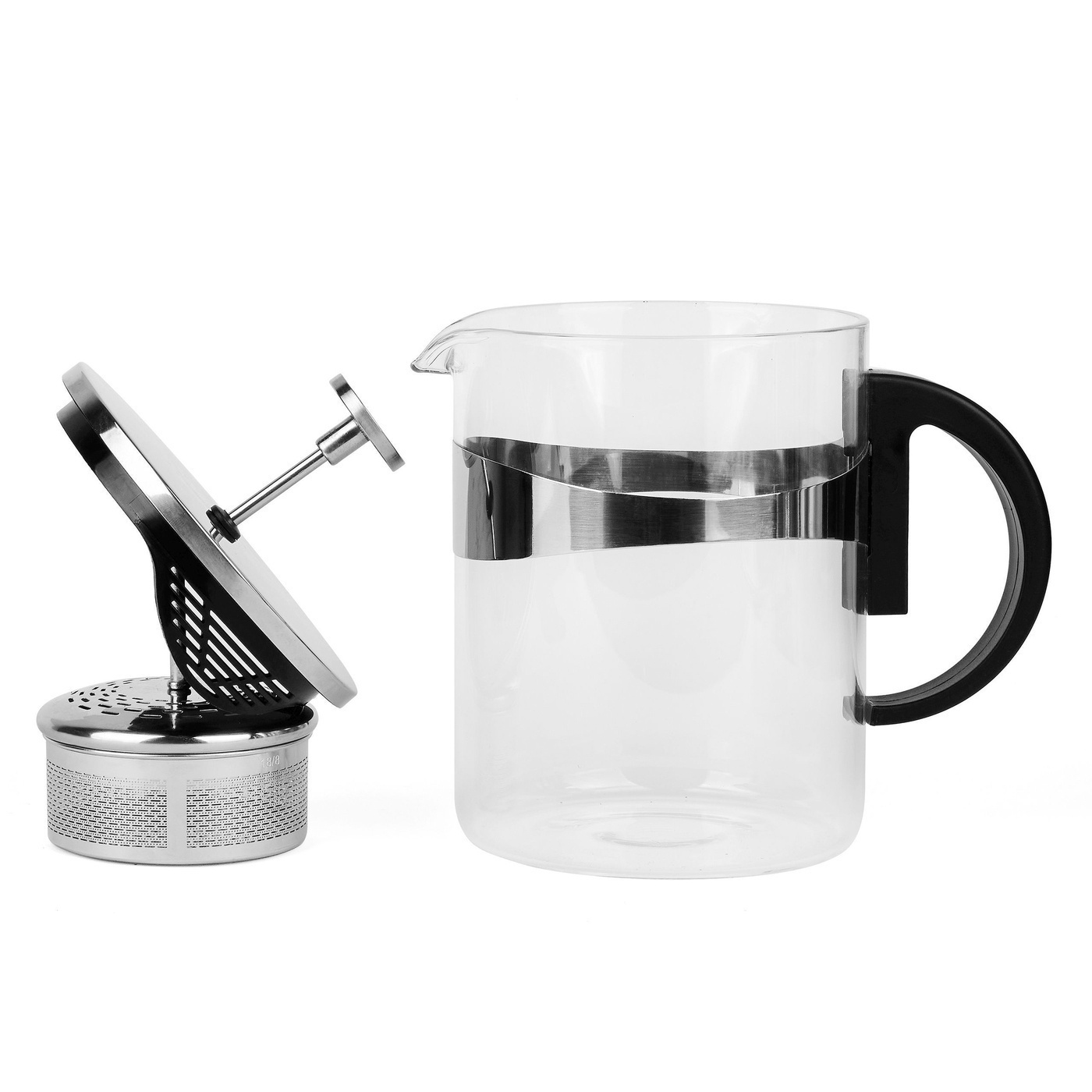 - dzbanek i podgrzewacz szklany - uchwyt dzbanka z tworzywa sztucznego w kolorze czarnym zamocowany na stalowej obręczy - pokrywka z tworzywa sztucznego stylizowana na metal z zamontowanym na stałe zaparzaczem ze stali nierdzewnej - brak swieczki w zestawie |