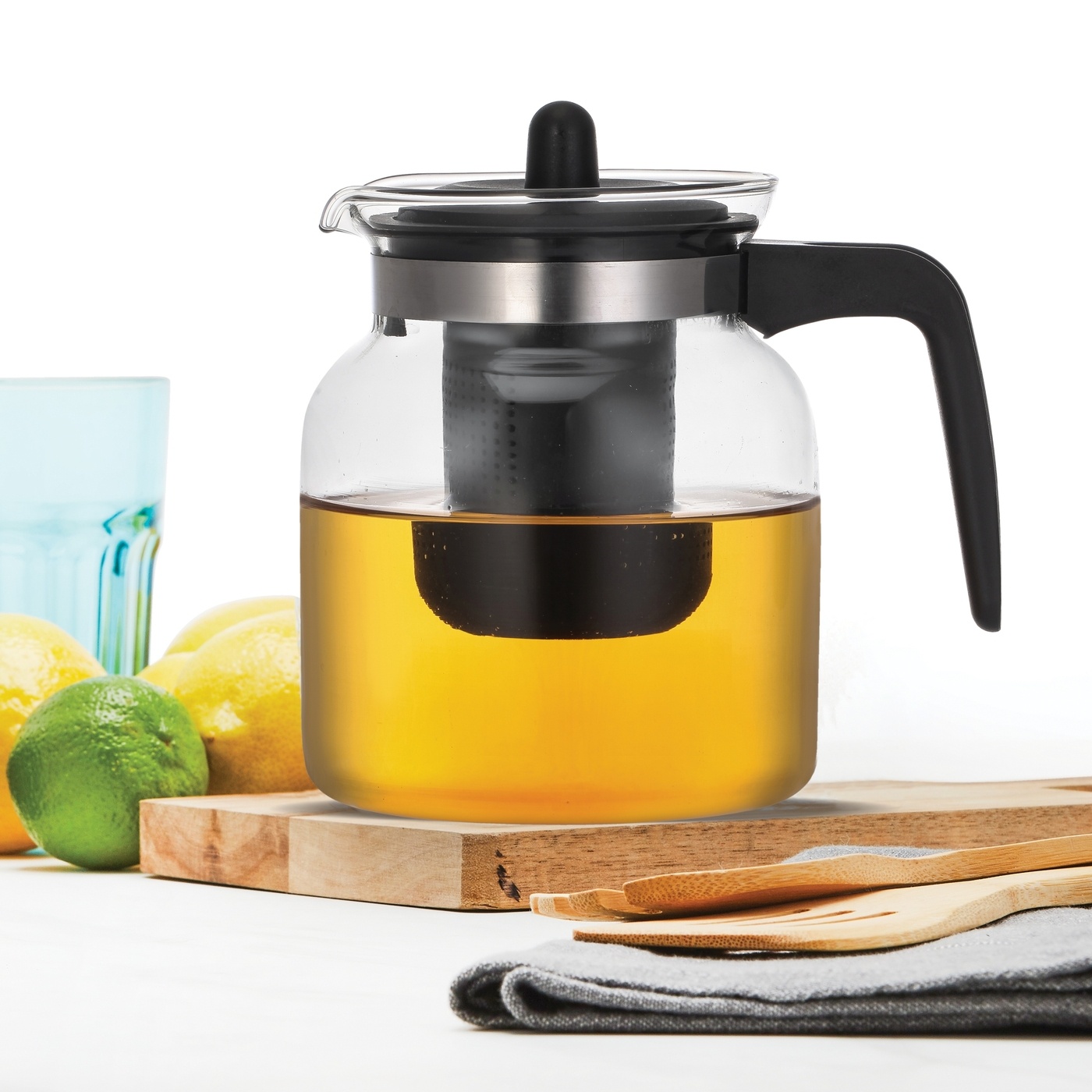 Połączenie szkła z czarnym tworzywem sztucznym (uchwyt, zaparzacz i pokrywka) oraz srebrną stalową obręczą świetnie wygląda. Estetycznie podasz herbatę podczas rodzinnego przyjęcia, spotkania z przyjaciółmi czy samotnego wieczoru z książką.