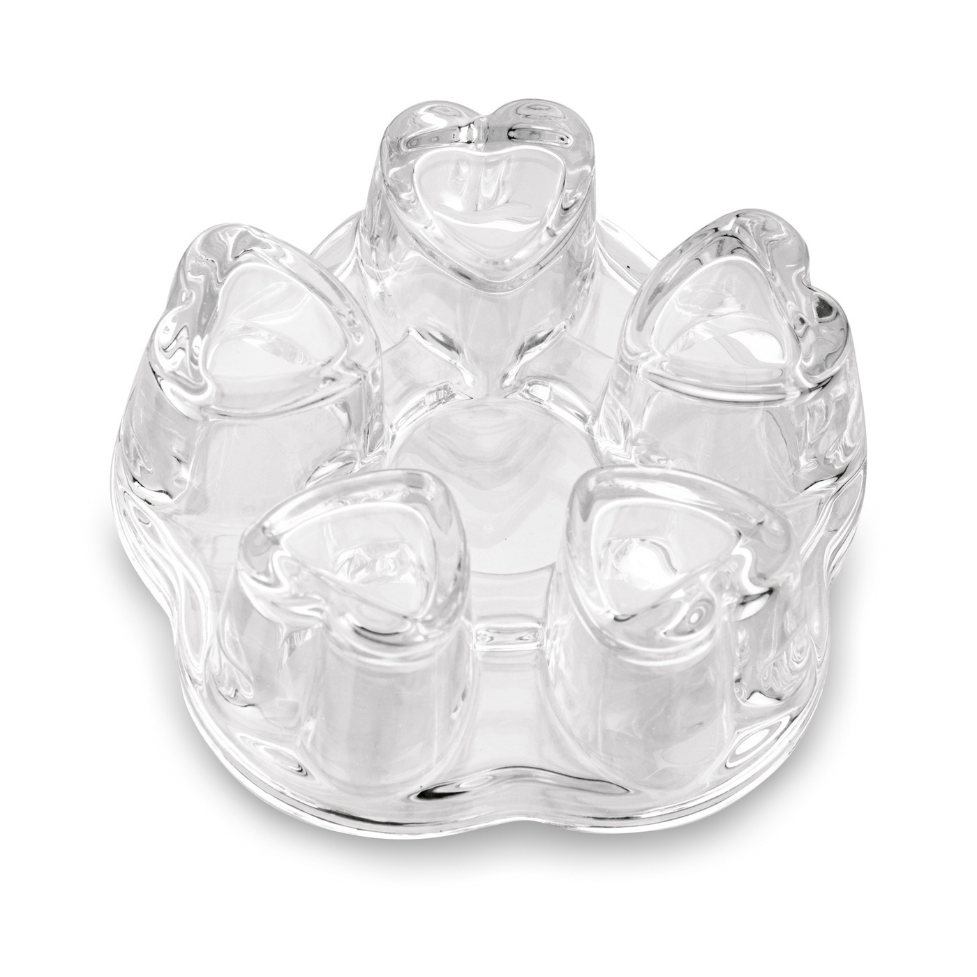 Podgrzewacz wykonano ze szkła i ozdobiono wycięciami w kształcie serduszek, które pełnią funkcję dekoracyjną i nadają całości lekki, elegancki charakter. Stabilna konstrukcja sprawia, że dzbanek stoi pewnie na podstawce.