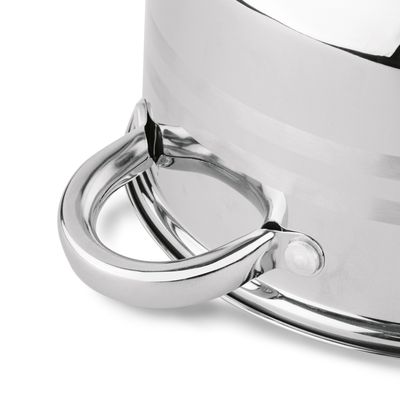- garnek ze stali nierdzewnej - wykończenie: połysk z satynowymi paskami - pokrywa szklana ze stalowym rantem i odpowietrznikiem - uchwyty garnka stalowe, nitowane - uchwyt pokrywy stalowy, przykręcany - skala litrażu - w przypadku nagrzania się produktu zalecamy używanie rękawic kuchennych |