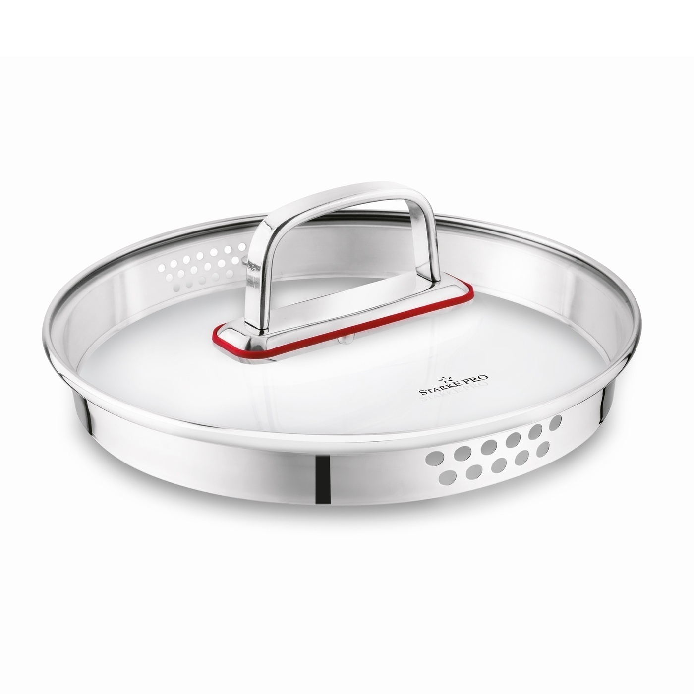 Model posiada szklaną pokrywkę z odpowietrznikiem pary, która pozwala kontrolować proces gotowania bez konieczności jej podnoszenia. Odpowiednia cyrkulacja pary ogranicza ryzyko kipienia i poprawia komfort pracy. Dodatkowo stalowy rant pokrywki chroni jej krawędzie przed wyszczerbieniem, co zwiększa trwałość całego elementu i pozwala na wieloletnie użytkowanie.