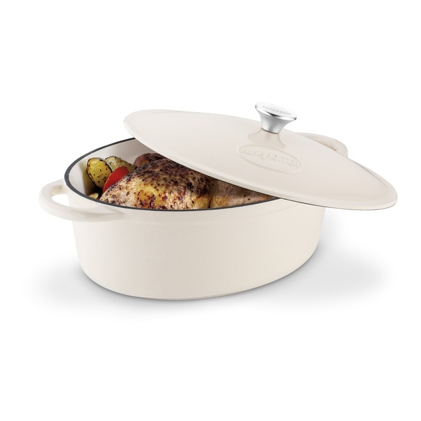 Korpus wykonano z odlewanego żeliwa, które słynie z doskonałej akumulacji i równomiernego rozprowadzania ciepła. Dzięki temu potrawy pieką się i duszą równomiernie, zachowując soczystość oraz pełnię smaku. Po nagrzaniu naczynie długo utrzymuje temperaturę, co sprzyja wolnemu pieczeniu i wydobywaniu aromatu przypraw.