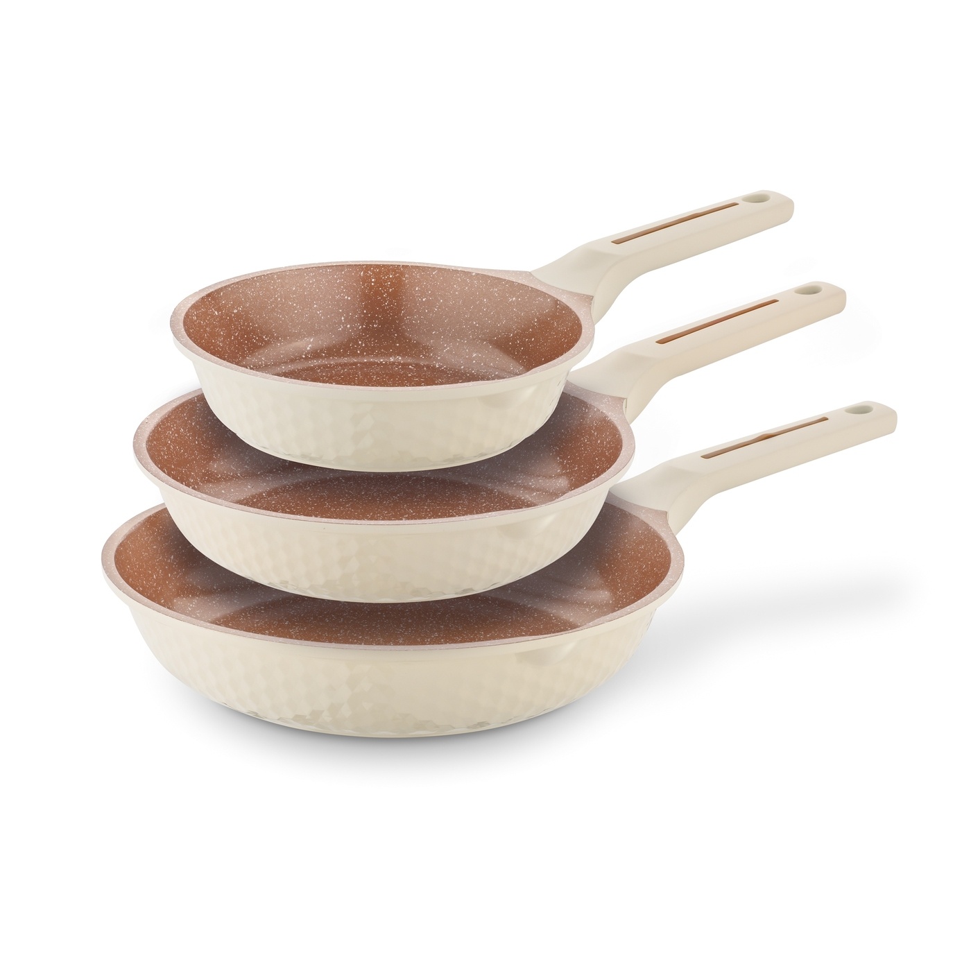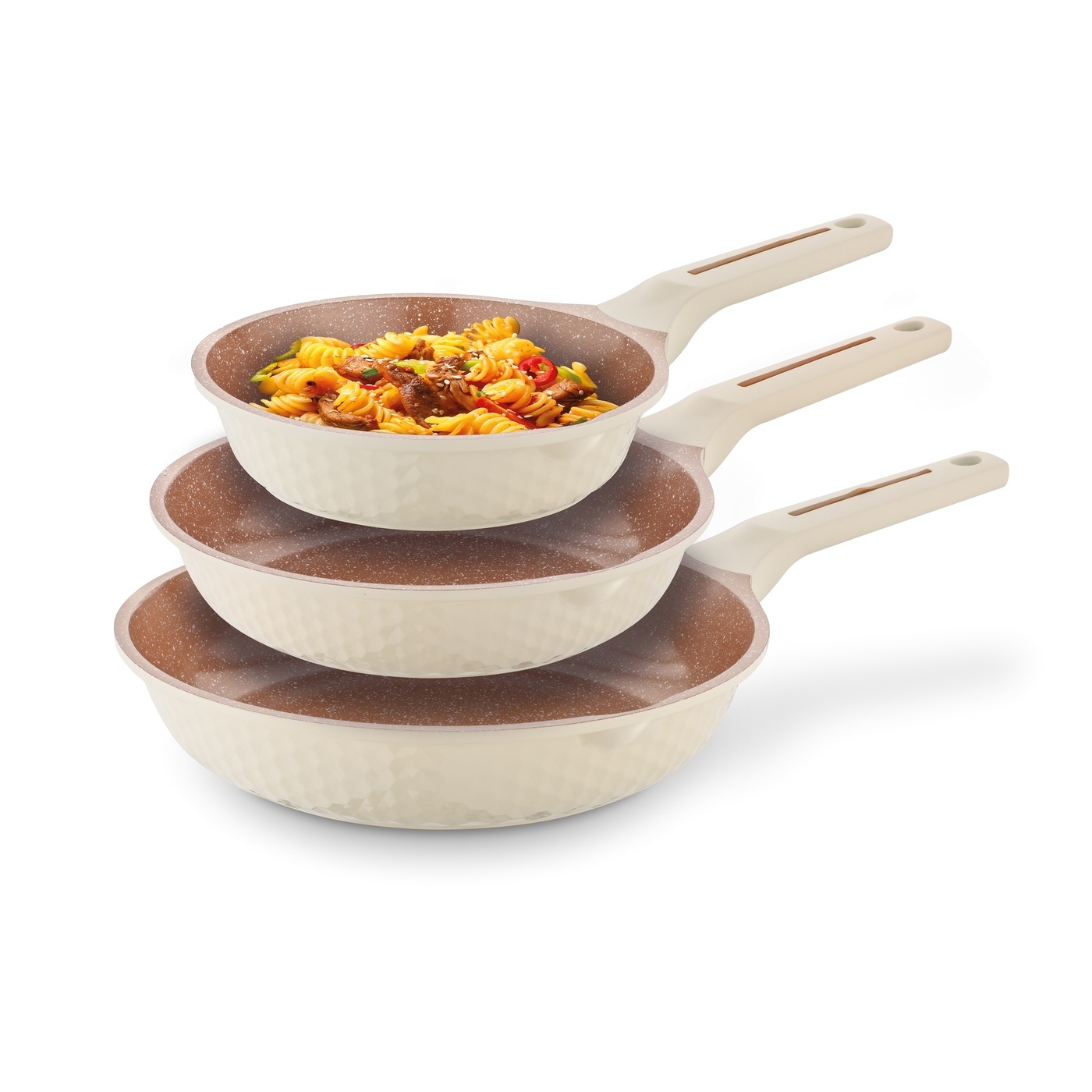 Zestaw patelni Starke Pro Texture Creamy to idealne rozwiązanie dla osób, które cenią wygodę, funkcjonalność i estetykę w kuchni. W komplecie znajdują się trzy patelnie o średnicach 20 cm, 24 cm oraz 28 cm, dzięki czemu bez problemu dopasujesz naczynie do wielkości przygotowywanej potrawy.