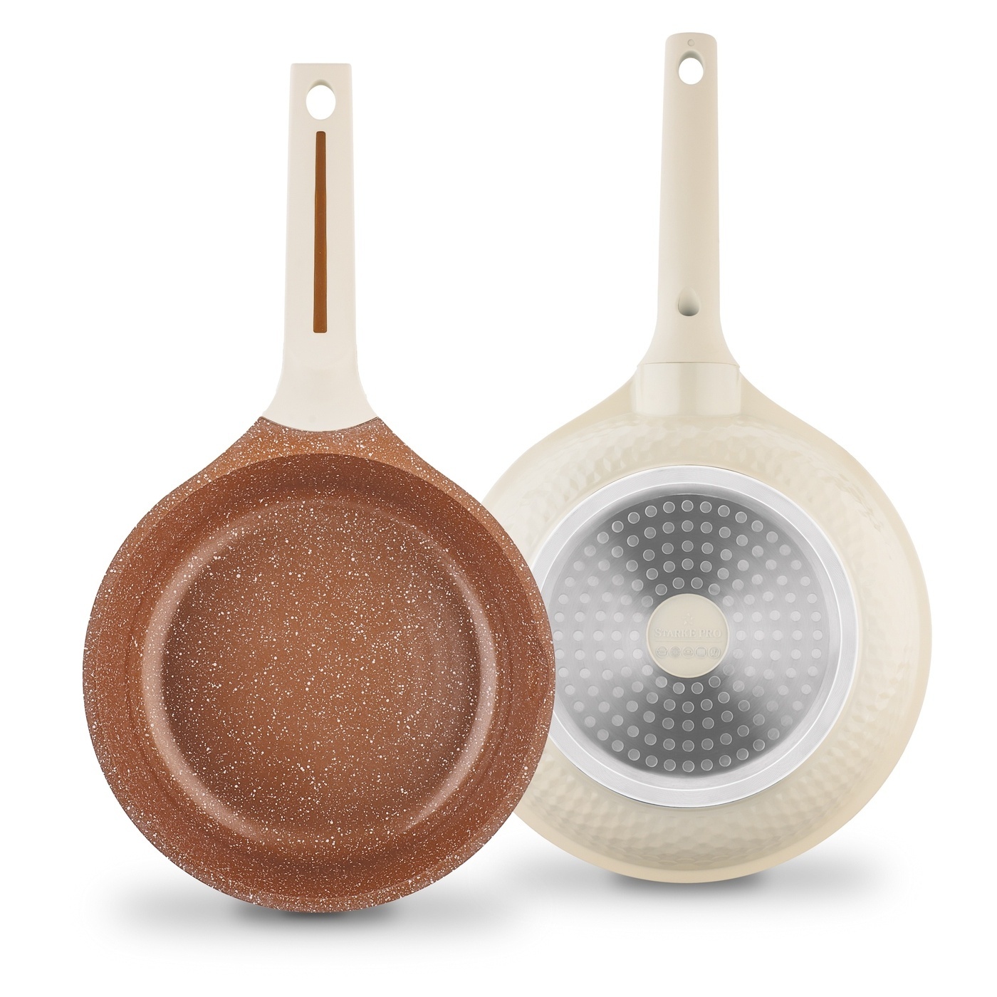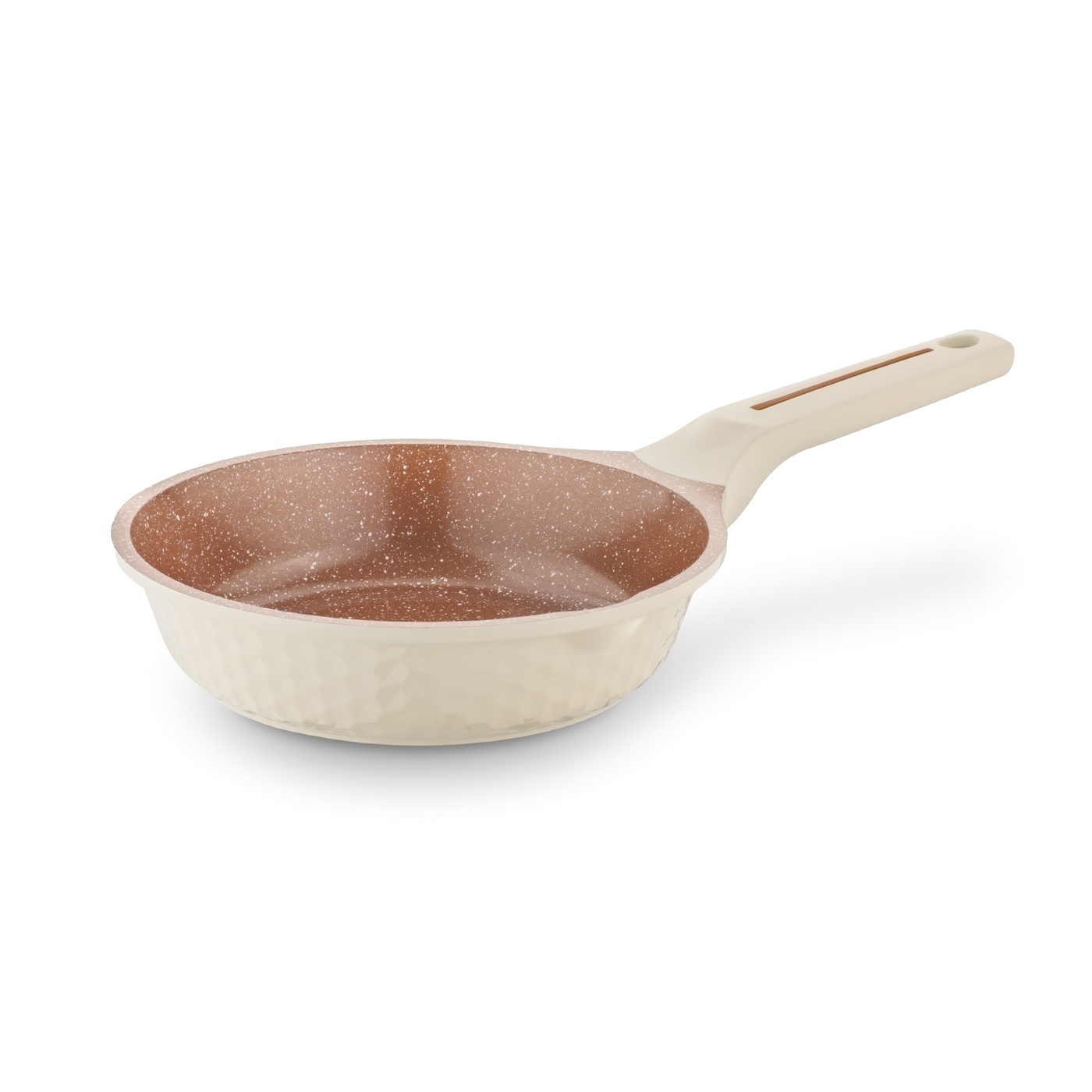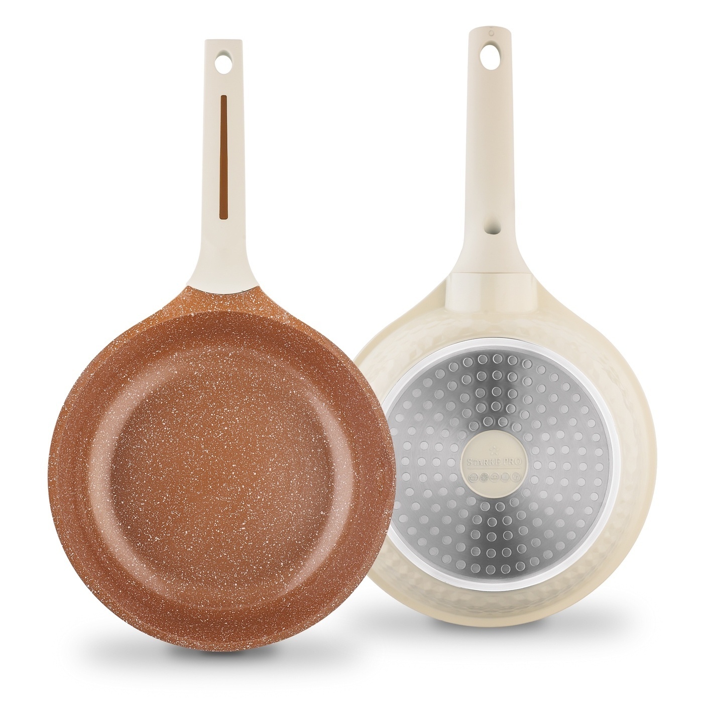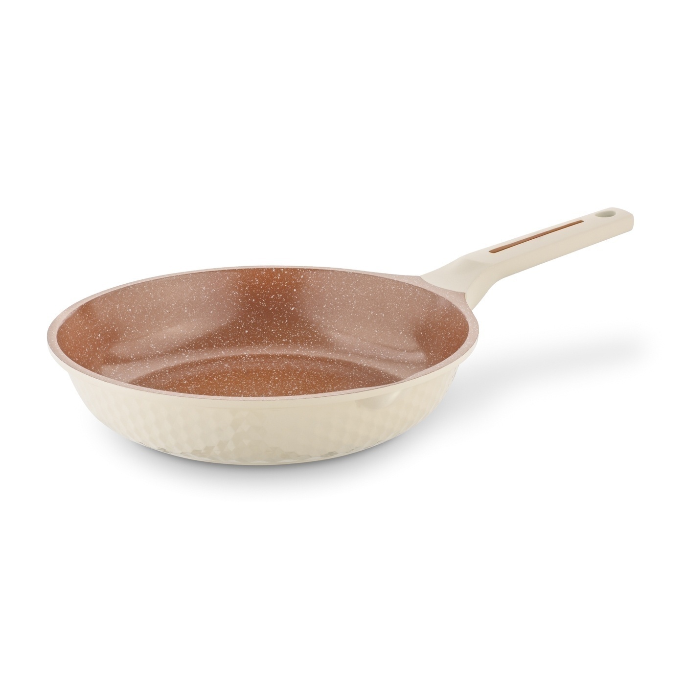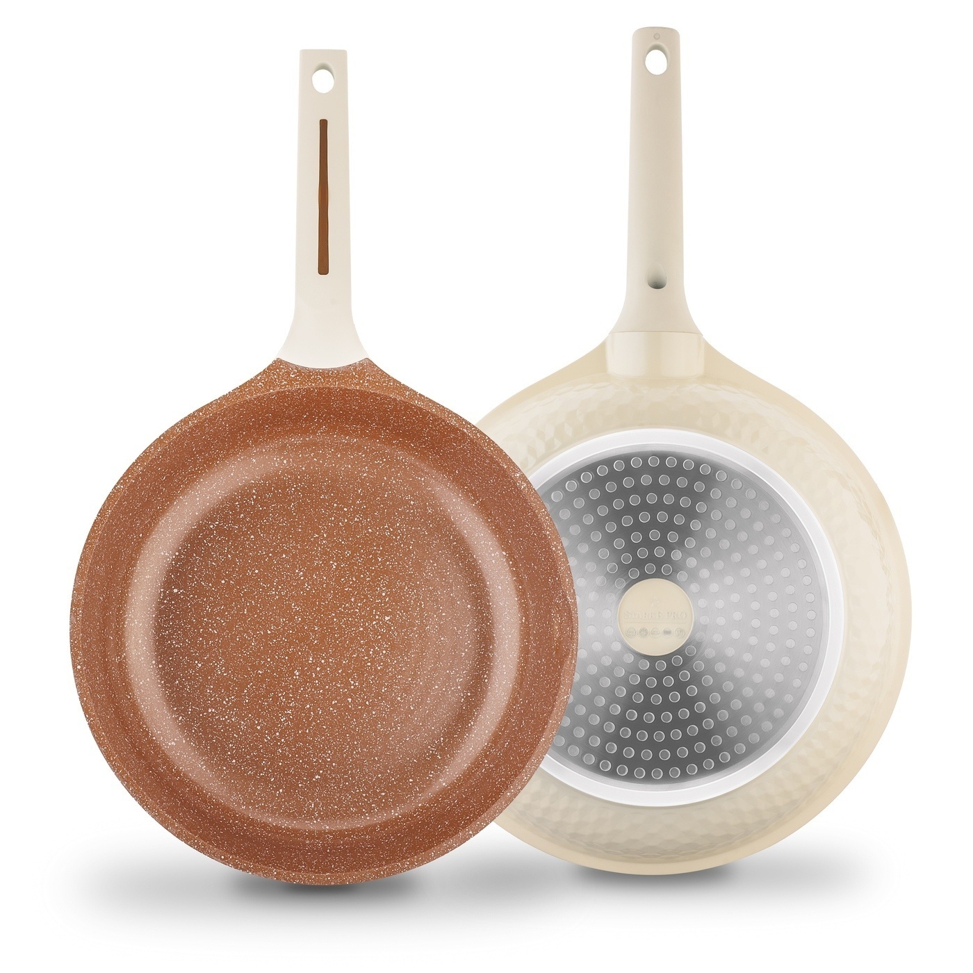 Uniwersalne dno pozwala korzystać z patelni na wszystkich rodzajach kuchenek - indukcyjnych, gazowych, elektrycznych oraz ceramicznych. Elegancki kremowy kolor sprawia, że zestaw doskonale wpisuje się w nowoczesne aranżacje kuchenne.