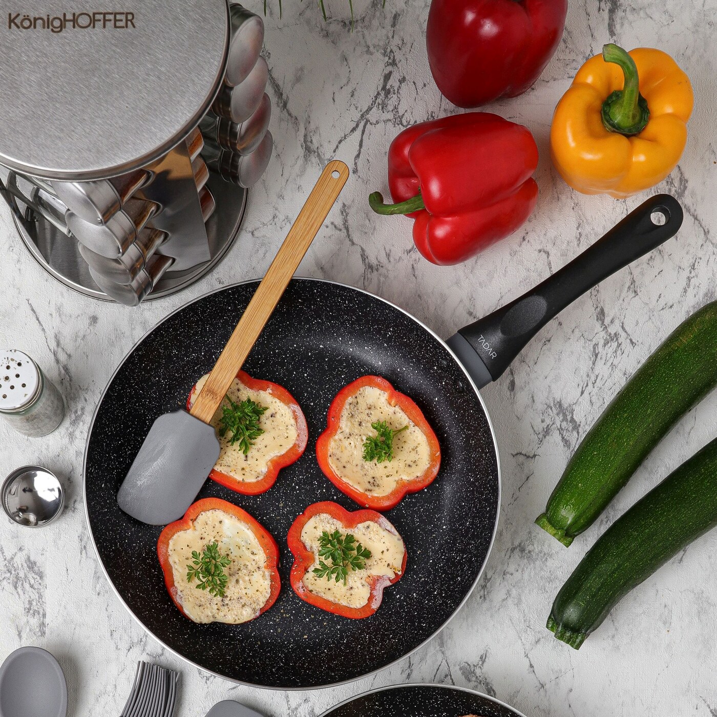 Nowoczesne, szare wykończenie z czarną nakrapianą powierzchnią sprawia, że zestaw prezentuje się stylowo i pasuje do większości aranżacji kuchennych. To połączenie funkcjonalności i estetyki.