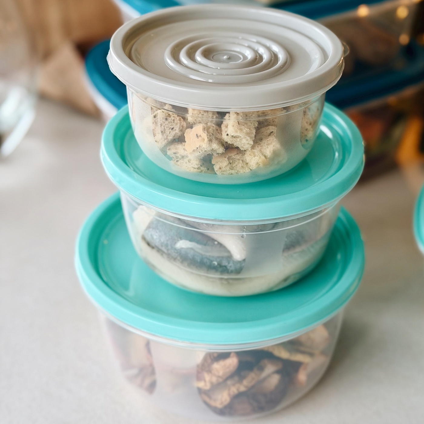 Masz ich w zestawie aż 7, więc zawsze znajdziesz ten właściwy np. na składniki kanapek. Ser i wędliny nie będą w ten sposób szybko wysychały. Te okrągłe pojemniki mają oznaczenie BPA Free, więc są też bezpieczne dla produktów spożywczych.