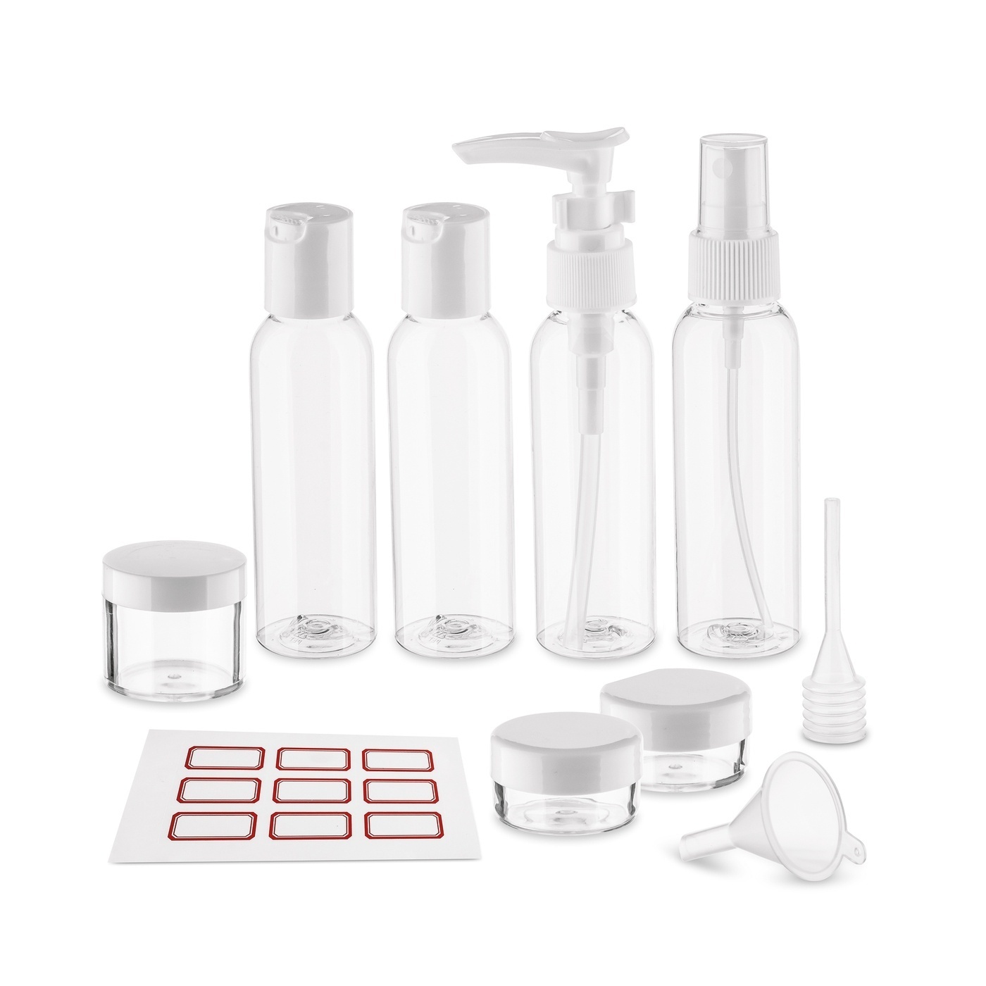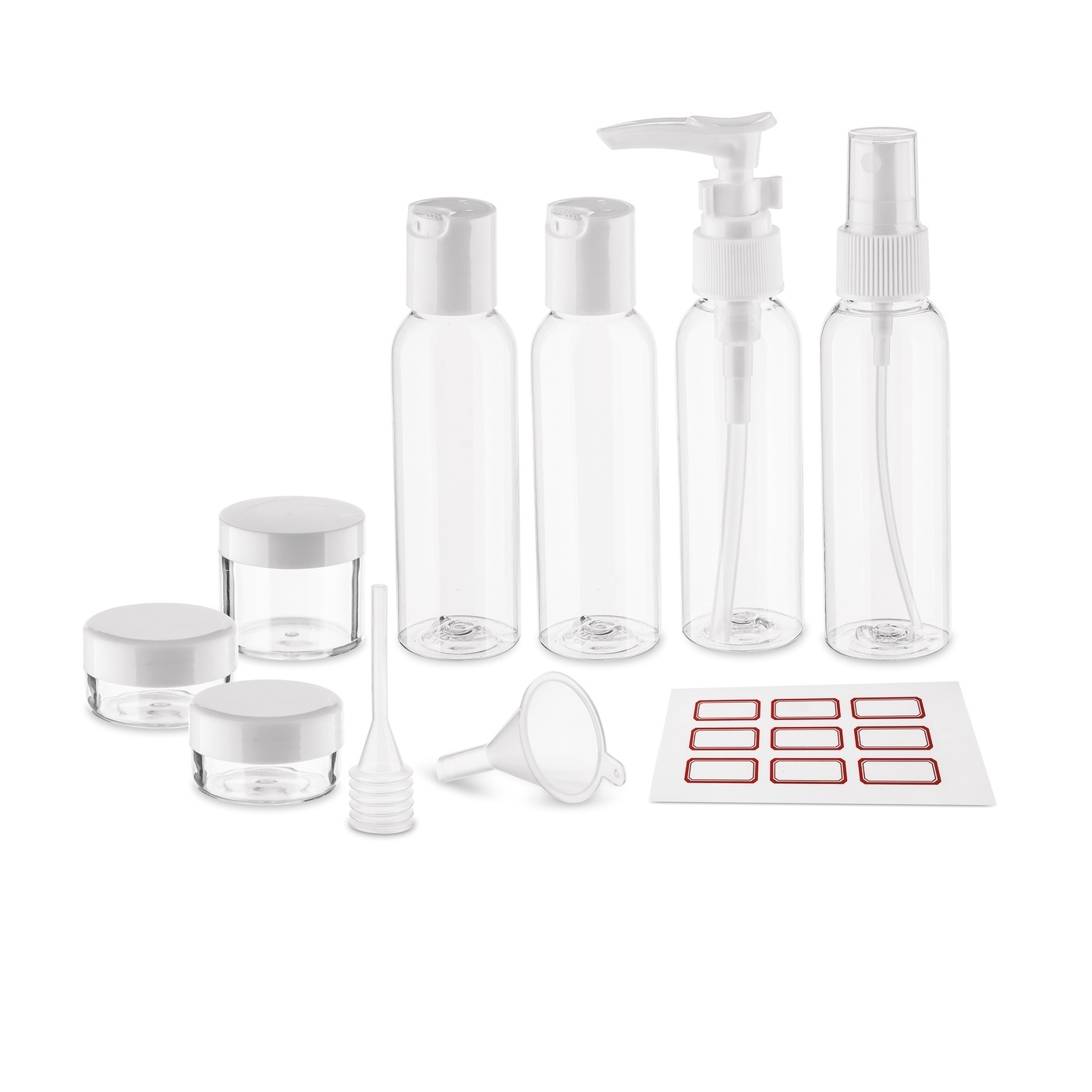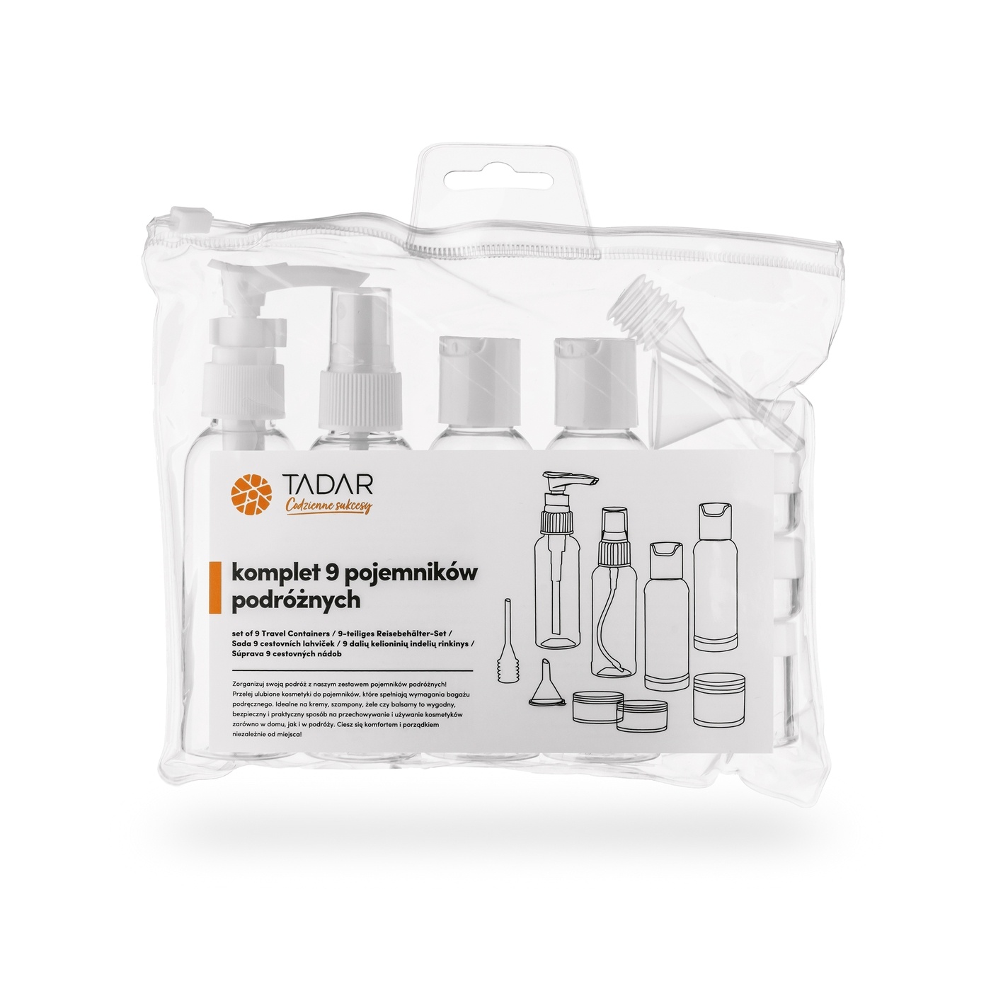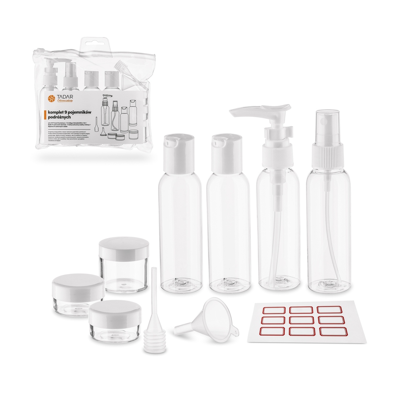 Wybierając ten produkt, otrzymujesz 3 pojemniczki z zakrętką na kremy i balsamy oraz 4 buteleczki. Komplet Tadar Trip 11 elementów oferuje też wybór różnych metod dozowania, od precyzyjnego wyciskania, przez pompkę, aż po atomizer. Co jest gdzie, oznaczysz z pomocą dodanych 9 naklejek.