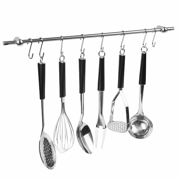 - tłuczek do ziemniaków, wymiary: wysokość: 27 cm, długość: 9 cm, szerokość: 7,5 cm, wielkość pojedynczego oczka: 0,9 x 0,5 cm - łyżka cedzakowa, wymiary: długość: 36 cm, szerokość: 11,5 cm, średnica powierzchni odcedzającej: 11,5 cm - trzepaczka do jajek i sosów, wymiary: długość: 32 cm, szerokość: 7,5 cm, długość ubijaka: 12 cm - widelec do mięsa, wymiary: długość: 33, szerokość: 3,5 cm, długość zębów: 7 cm, odległość między zębami: 1,5 cm - łyżka do bigosu, wymiary: długość: 34 cm, szerokość: 7 cm, pojemność: 50 ml - nabierka wazowa, wymiary: długość: 31 cm, szerokość: 8,5 cm, pojemność: 160 ml - reling z 8 wieszakami, wymiar: długość: 54 cm, wymiar pojedynczego wieszaka: 7 x 3,1 cm |
