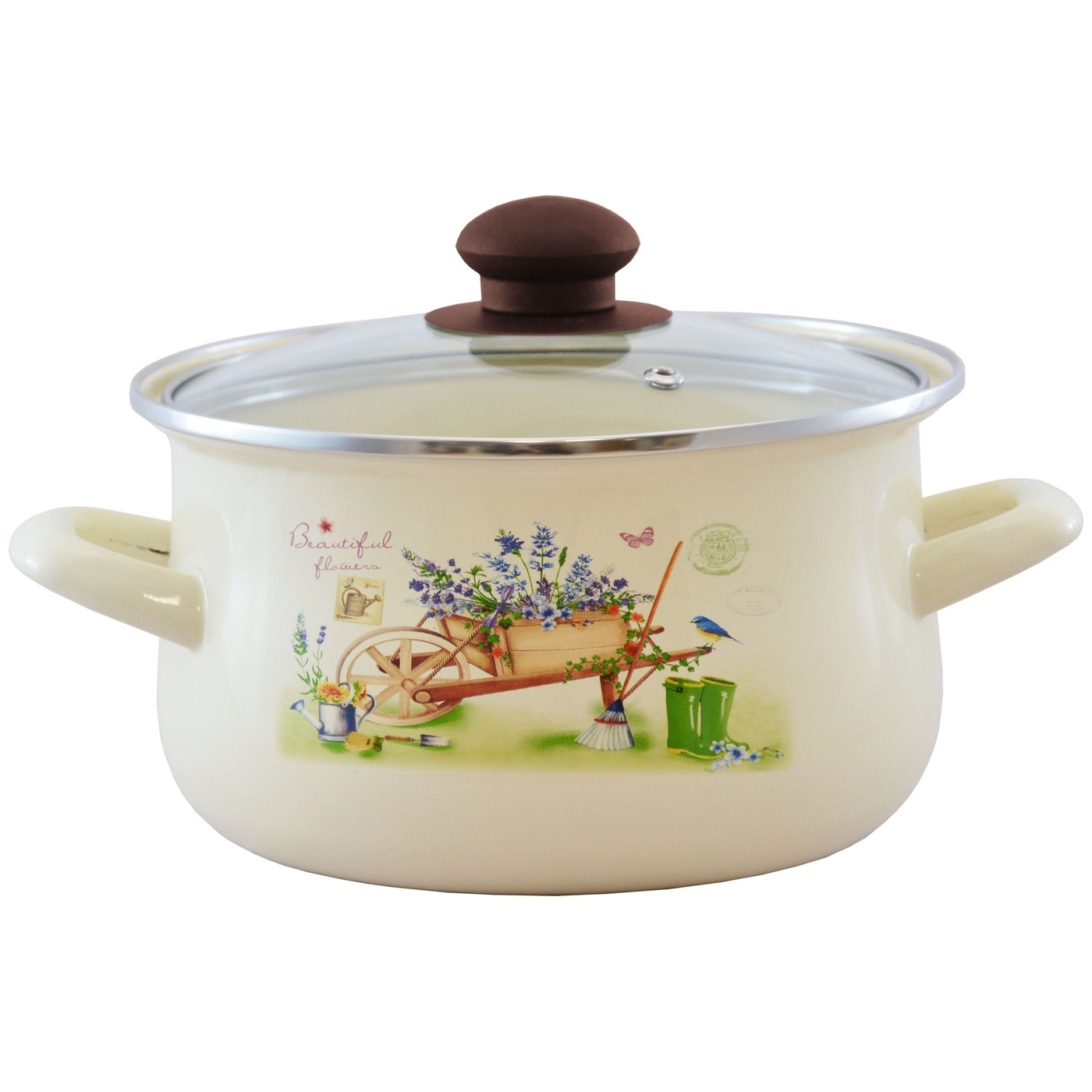 Każdy garnek został wykonany ze stali węglowej pokrytej emalią, która zapewnia trwałość, odporność na użytkowanie oraz łatwość czyszczenia. Emalia tworzy gładką, higieniczną powierzchnię, która nie wchłania zapachów i nie zmienia smaku potraw. Grafika Garden w kremowo-brązowej kolorystyce dodaje garnkom dekoracyjnego wyglądu, który świetnie komponuje się zarówno z klasycznymi, jak i nowoczesnymi wnętrzami kuchennymi.