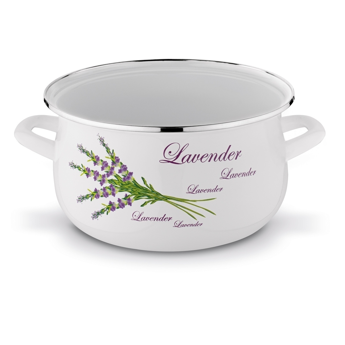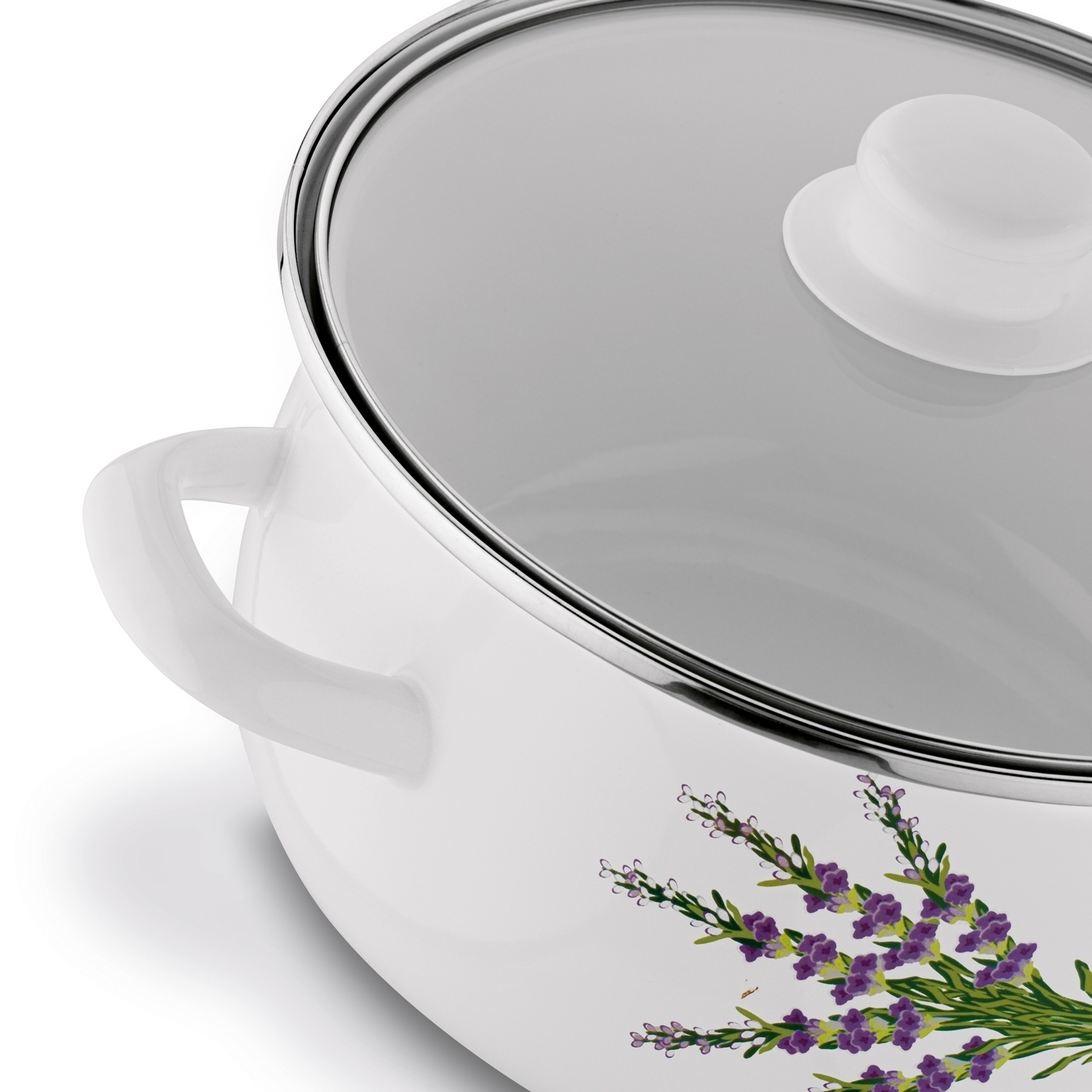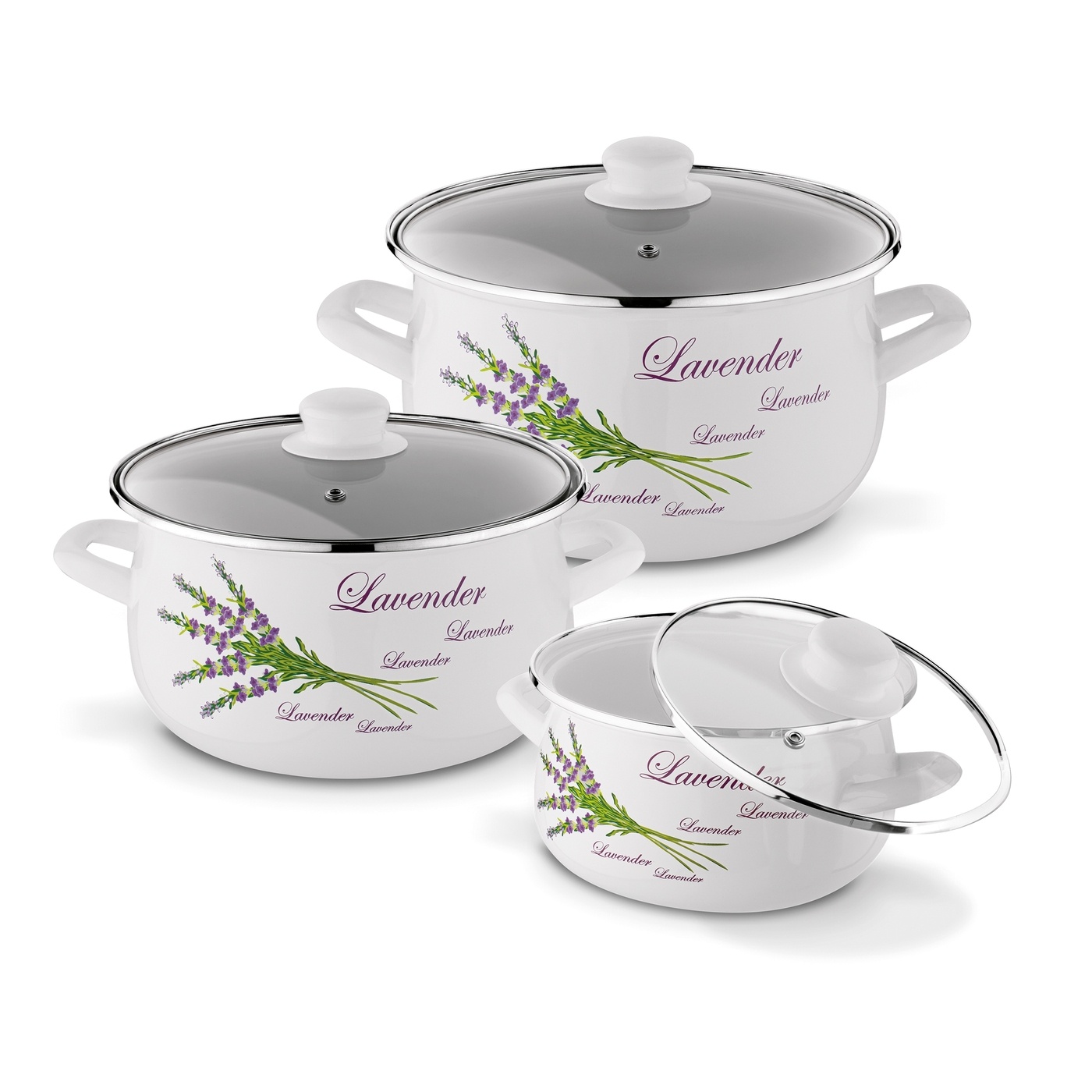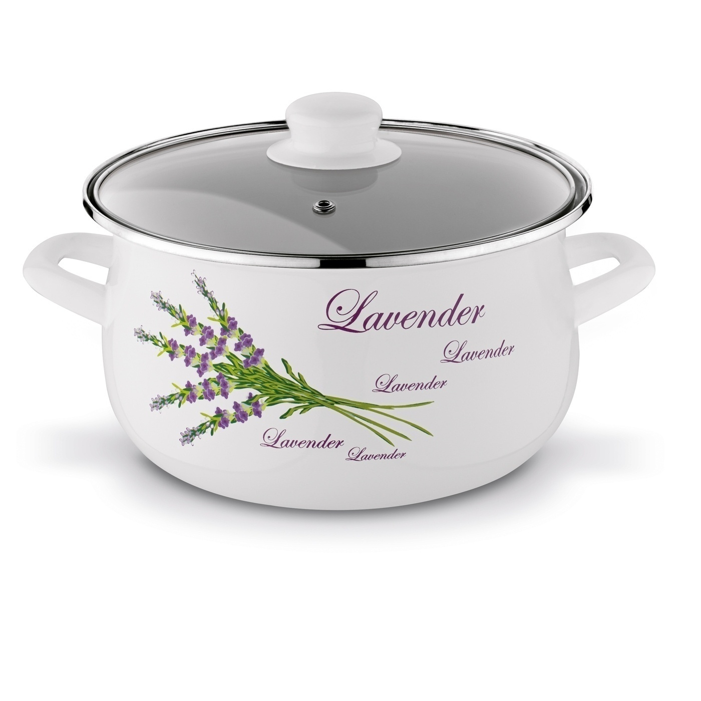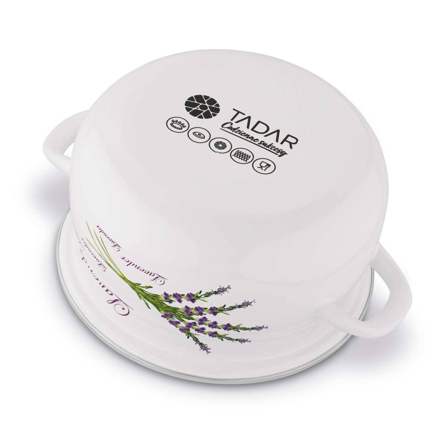 Zewnętrzna strona garnków zdobiona jest grafiką w stylu Lawenda, która nadaje im dekoracyjnego charakteru. Dzięki temu zestaw może stanowić estetyczne uzupełnienie kuchni i dobrze prezentuje się zarówno podczas gotowania, jak i serwowania potraw. Kolorystyka biało–fioletowa sprawia, że naczynia wpisują się w nowoczesne i klasyczne aranżacje kuchenne.