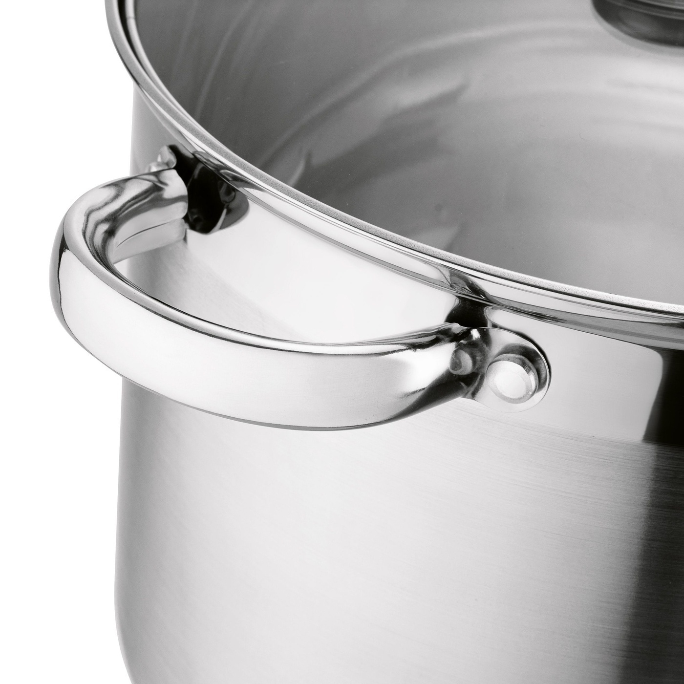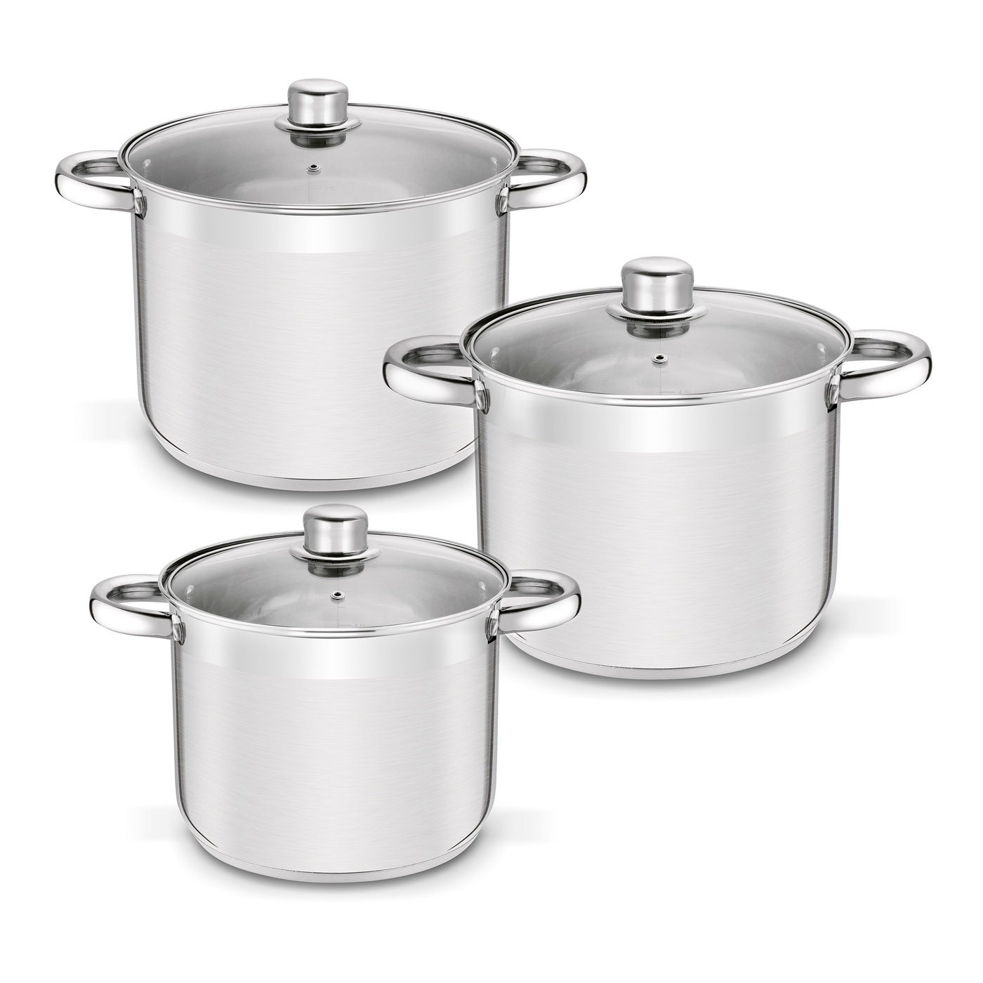 - garnki ze stali nierdzewnej - wykończenie zewnętrzne satyna z paskiem w połysku - wykończenie wewnętrzne: połysk - skala litrażu - pokrywy szklane ze stalowym rantem i odpowietrznikiem - uchwyty garnka nitowane - uchwyt pokrywy stalowy, przykręcany |
