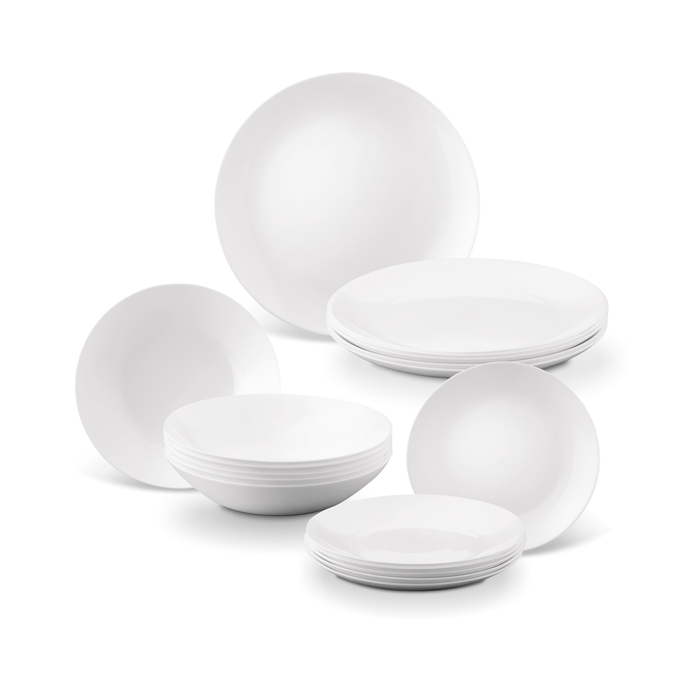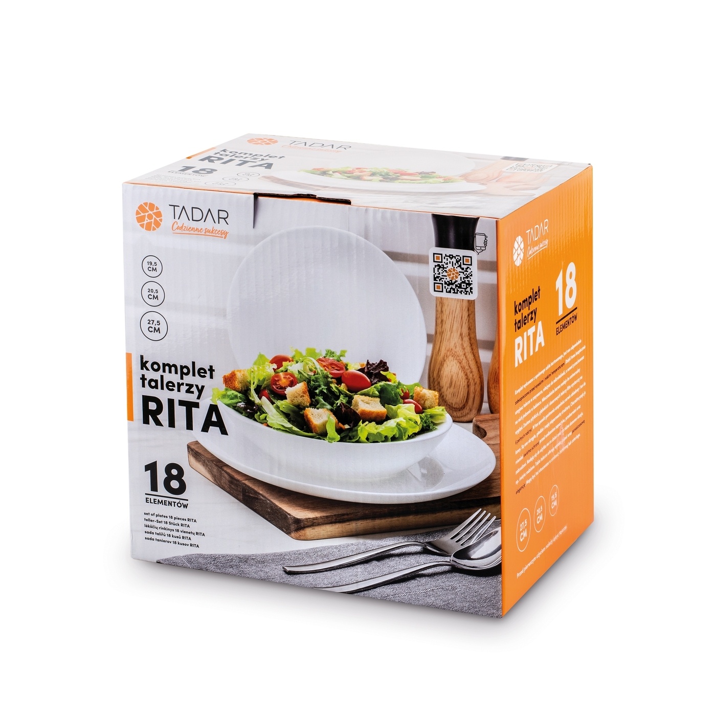 Komplet Tadar Rita to praktyczne i eleganckie rozwiązanie do codziennych posiłków oraz rodzinnych uroczystości. Zawiera 18 elementów, czyli zestaw dla 6 osób. W jego skład wchodzą: 6 talerzy obiadowych (27 cm), 6 talerzy głębokich (20 cm, 0,5 l użytkowej pojemności) oraz 6 talerzy deserowych (19 cm). Dzięki temu z łatwością podasz zarówno główne dania, jak i zupy czy desery.