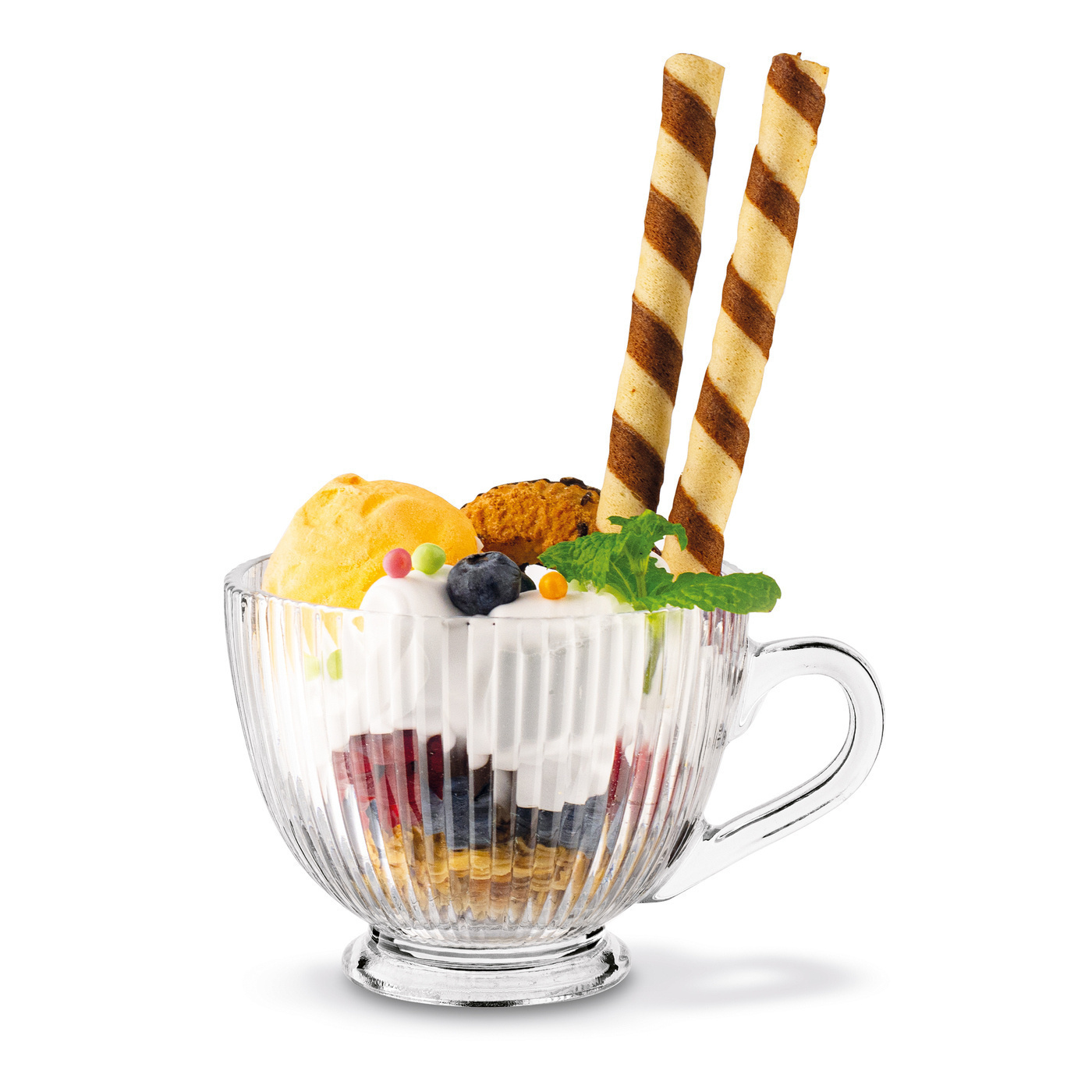 Produkt wykonano z trwałego, przezroczystego szkła. Jest ono w stanie wytrzymać szok termiczny do 70 st. Celsjusza. Sprawia to, że filiżanka nadaje się zarówno do zimnych jak i ciepłych napojów.