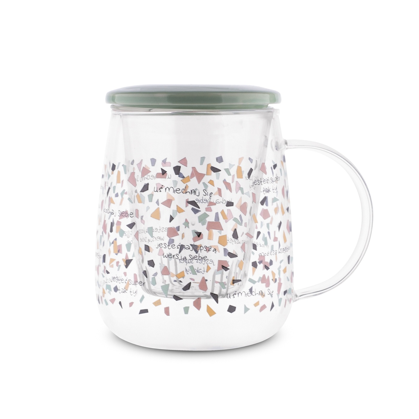 - kubek i zaparzacz wykonany ze szkła borokrzemowego - szkło odporne na wysokie temperatury do 100 st. C - pokrywka ceramiczna - wysokość kubka bez pokrywki: 11 cm - pojemność kubka 0,5 l |