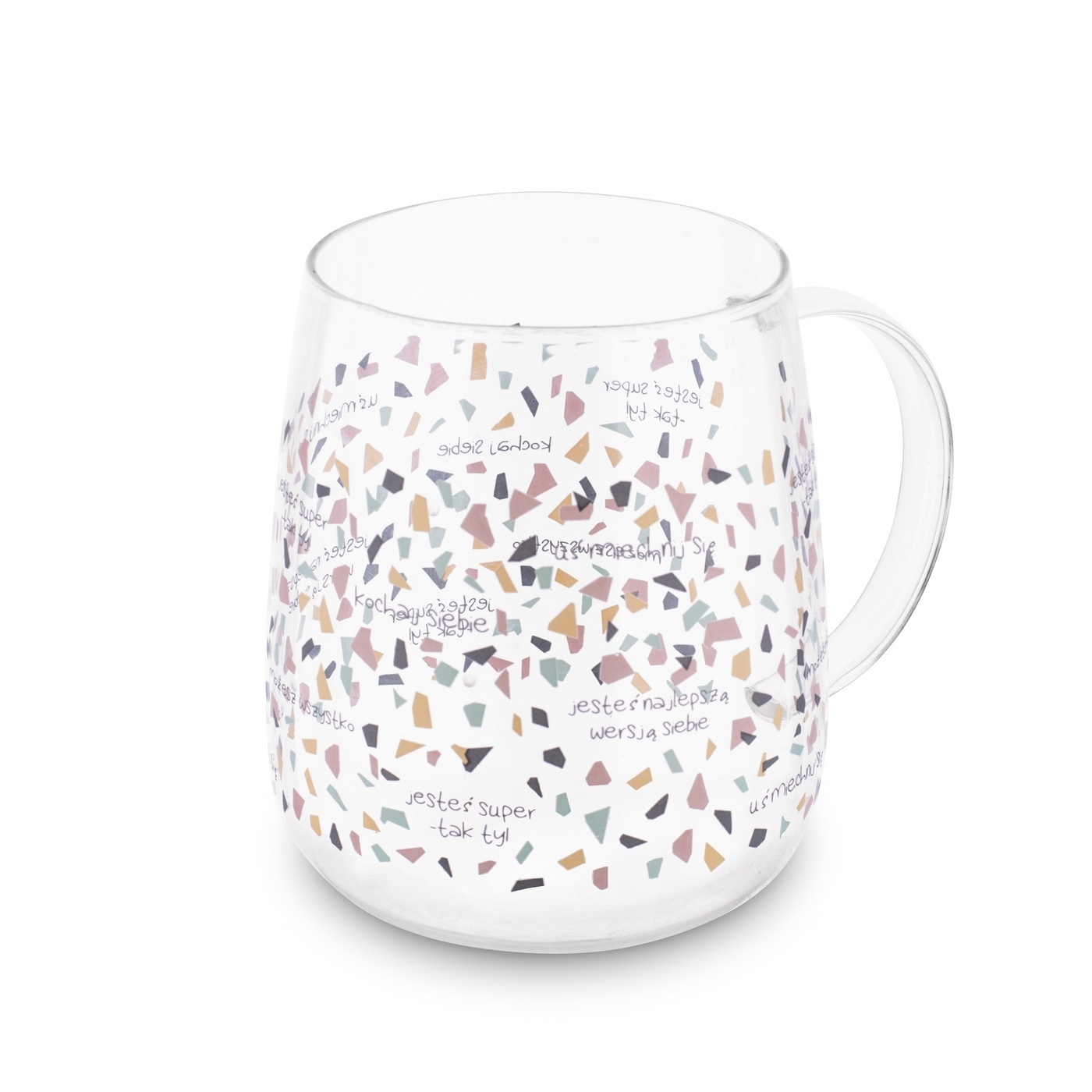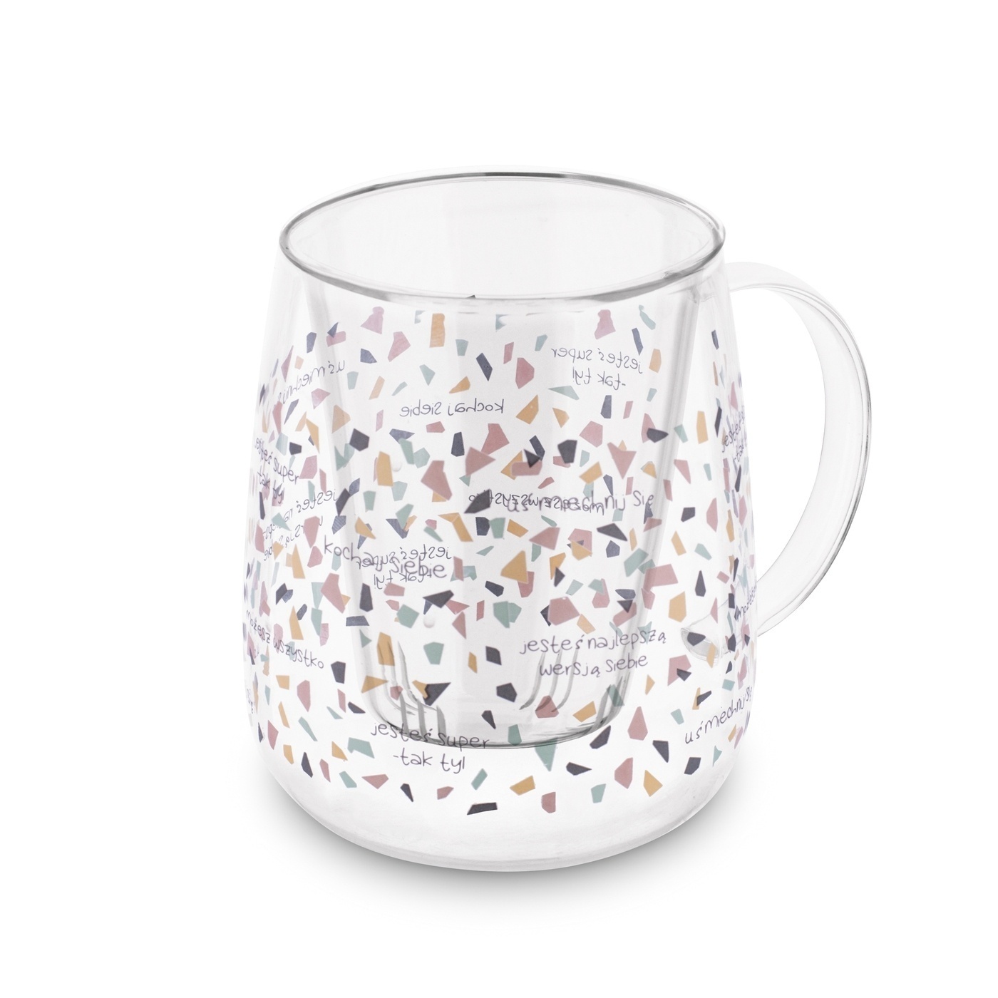 Szklankę wykonano ze szkła borosilikatowego. Sprawia to, że jest lekka i krystalicznie przejrzysta. Posiada również wysoką odporność na matowienie. Model w żadnym stopniu nie wypłynie na smak i aromat wlanych napojów. Jest też estetycznie wzbogacony o kolorowy motyw ozdobny.