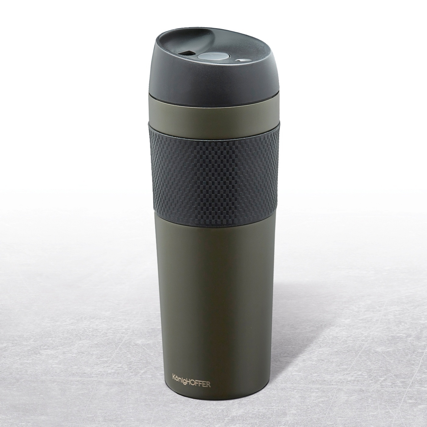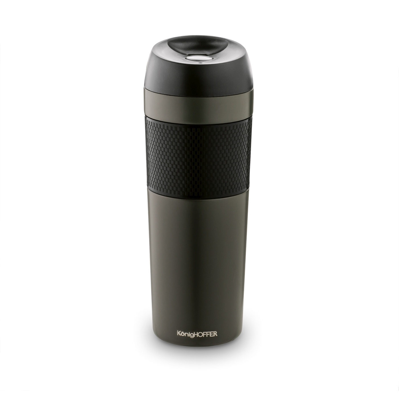 Kubek z podwójnymi ściankami i termoizolacją próżniową Konighoffer Nevis ma pojemność 450 ml. Nada się więc na małe i duże podróże, a także na kawę do pracy. Model jest szczelny, a by się napić, wystarczy użyć prostego mechanizmu. Zamknięcie ma kształt dający komfort gaszenia pragnienia.
