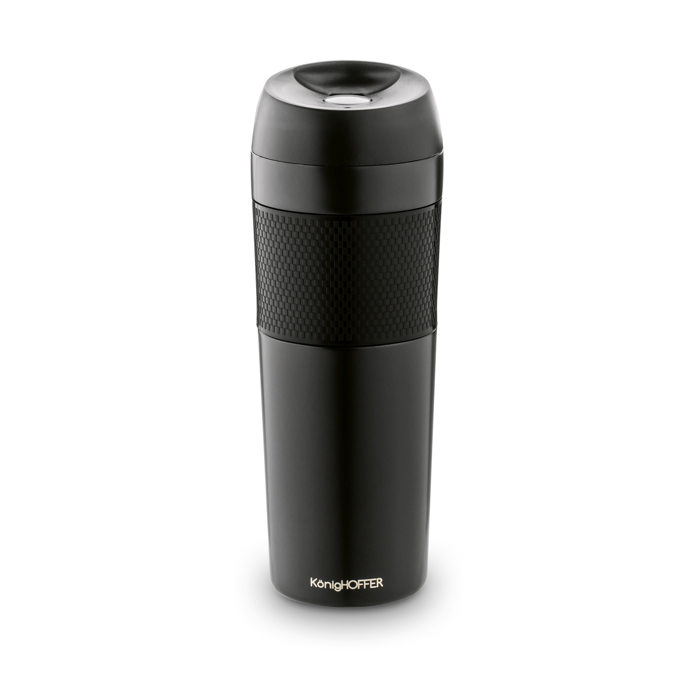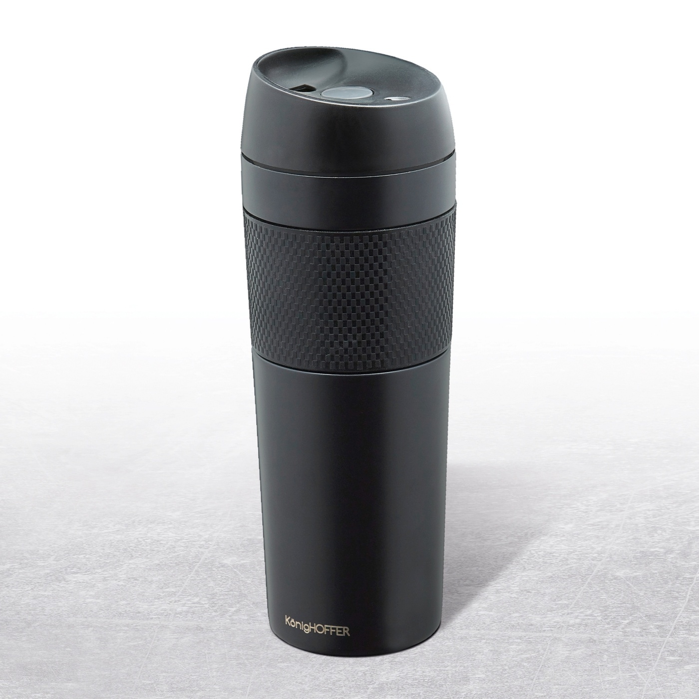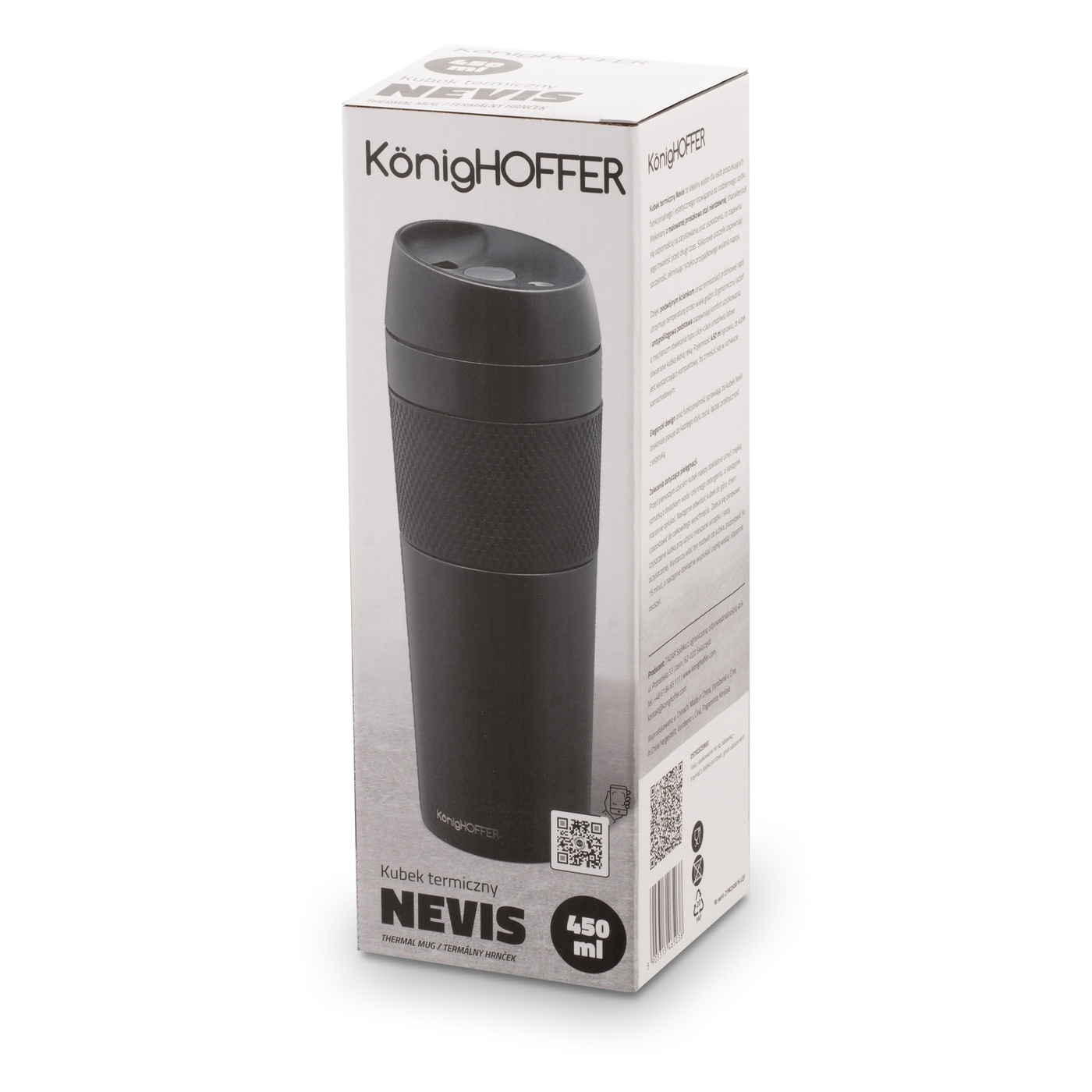 Kubek z podwójnymi ściankami i termoizolacją próżniową Konighoffer Nevis ma pojemność 450 ml. Nada się więc na małe i duże podróże, a także na kawę do pracy. Model jest szczelny, a by się napić, wystarczy użyć prostego mechanizmu. Zamknięcie ma kształt dający komfort gaszenia pragnienia.