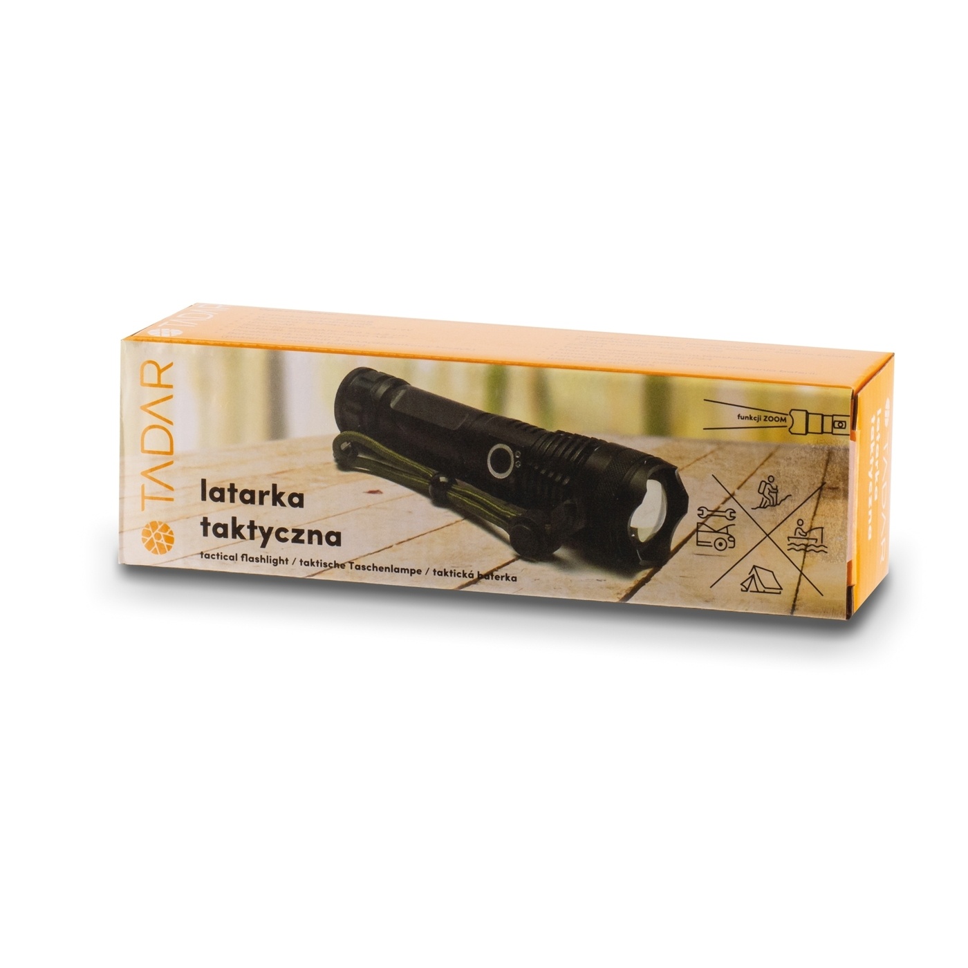 Aluminiowa obudowa tej mocnej latarki taktycznej posiada klasę odporności IP44. Oznacza to, że możesz korzystać z niej w deszczu. Oferuje także zabezpieczenie przed kurzem. Ponadto ma teleskopową funkcję ZOOM do skupiania wiązki światła.