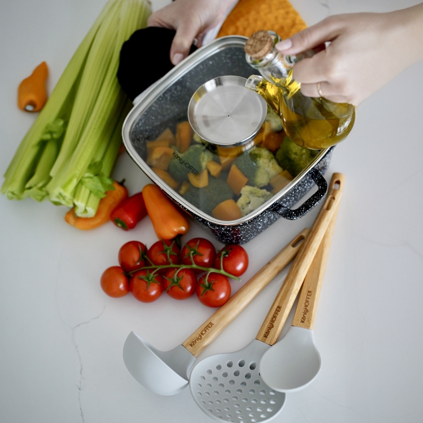 Łyżka silikonowa Konighoffer Gler 30 x 7 x 6,5 cm ma optymalne wymiary i poręczną formę. Końcówka z silikonu ma właściwości nieprzywierające. Wygodnie nałożysz na talerze warzywa czy sałatki.