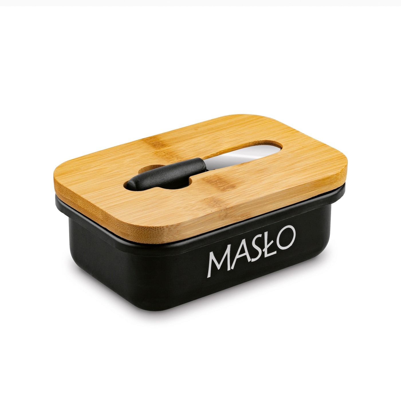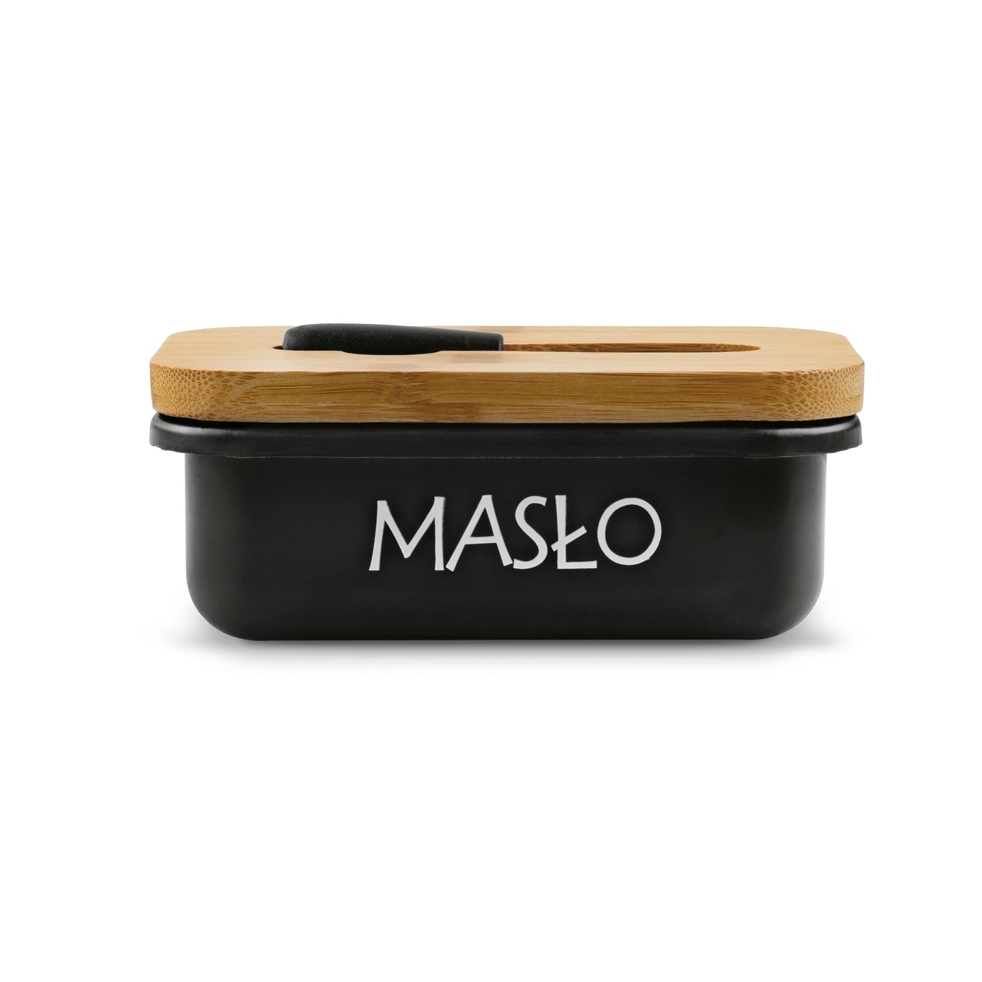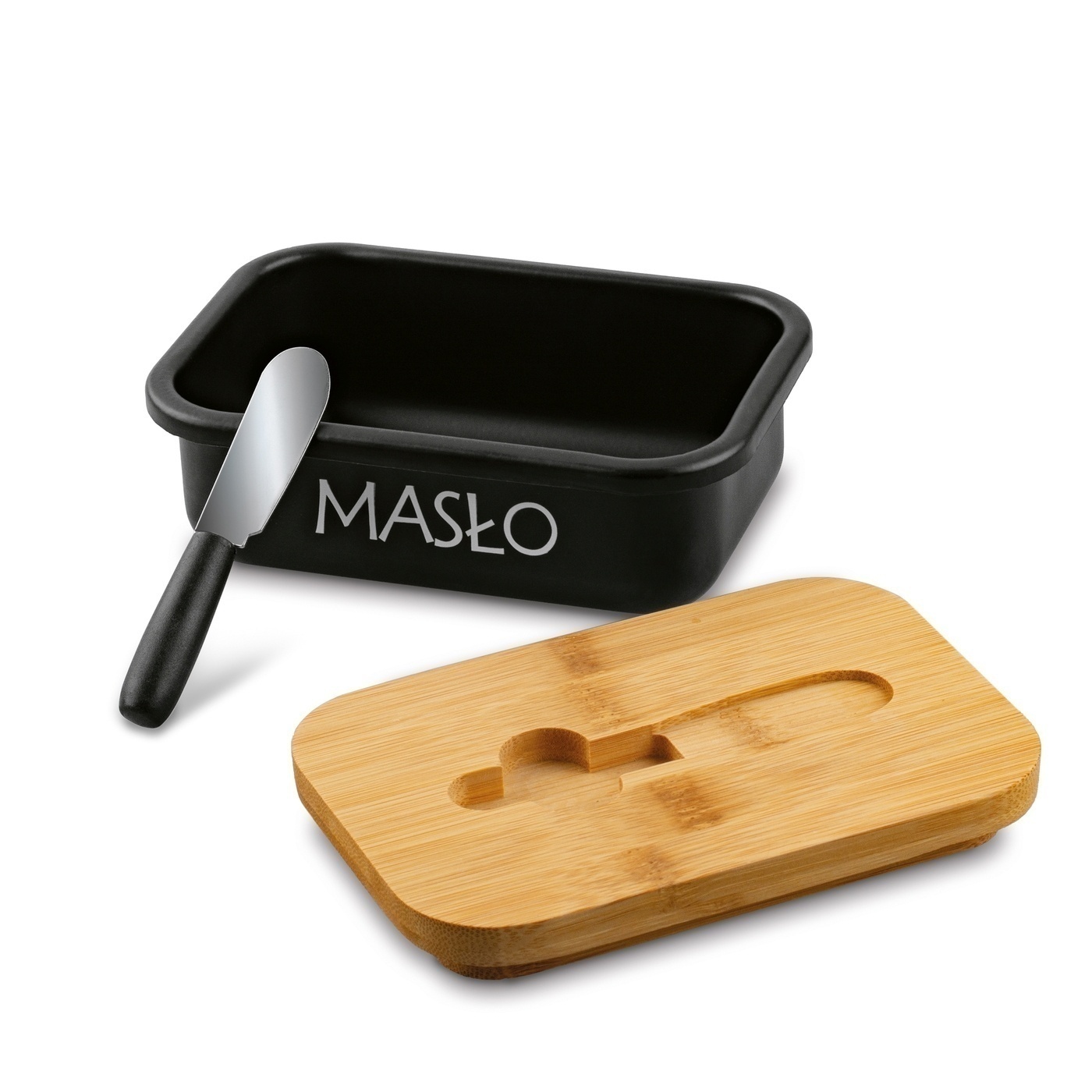 Produkt został wykonany ze stali malowanej proszkowo na czarno. Jej elegancja uzupełnia prestiżowy wygląd całego projektu. W komplecie z maselniczką Tadar 15,5 x 10,5 x 6,5 cm znajduje się również pokrywka z drewna bambusowego.
