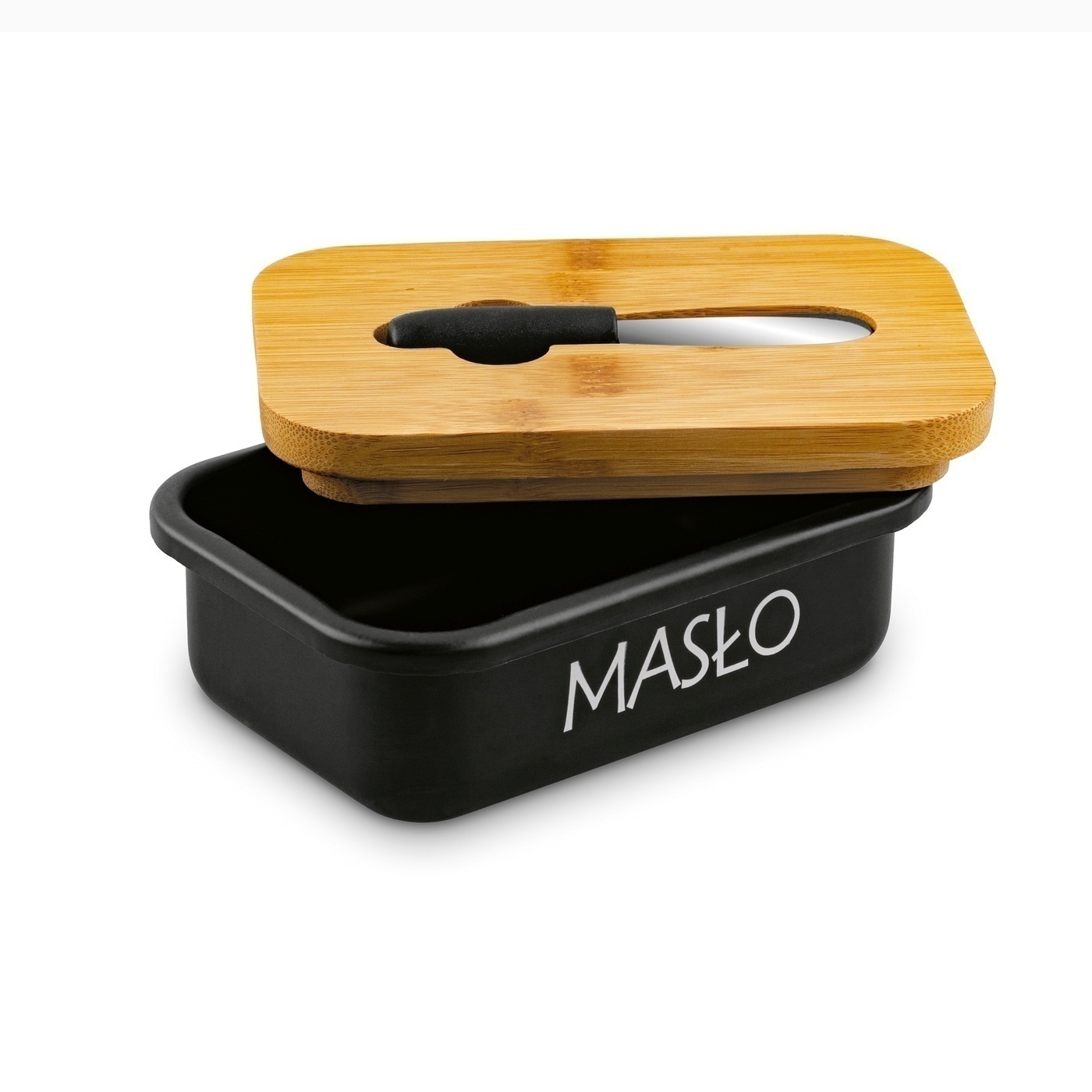 - maselnica stalowa, malowana proszkowo - pokrywa bambusowa - nożyk stalowy z czarną bakelitową rączką - wymiary maselnicy bez pokrywki: 15,5 x 10,5 x 5 cm - wymiary nożyka: 10,5 x 2 cm |