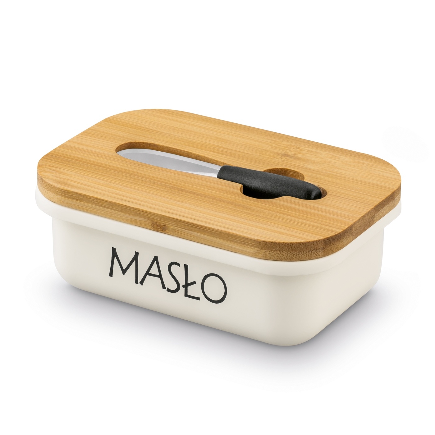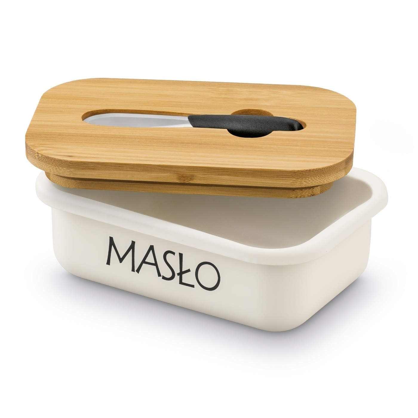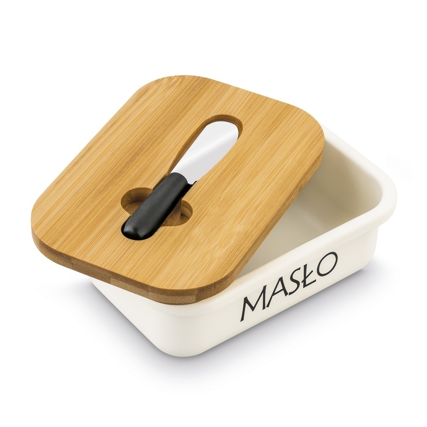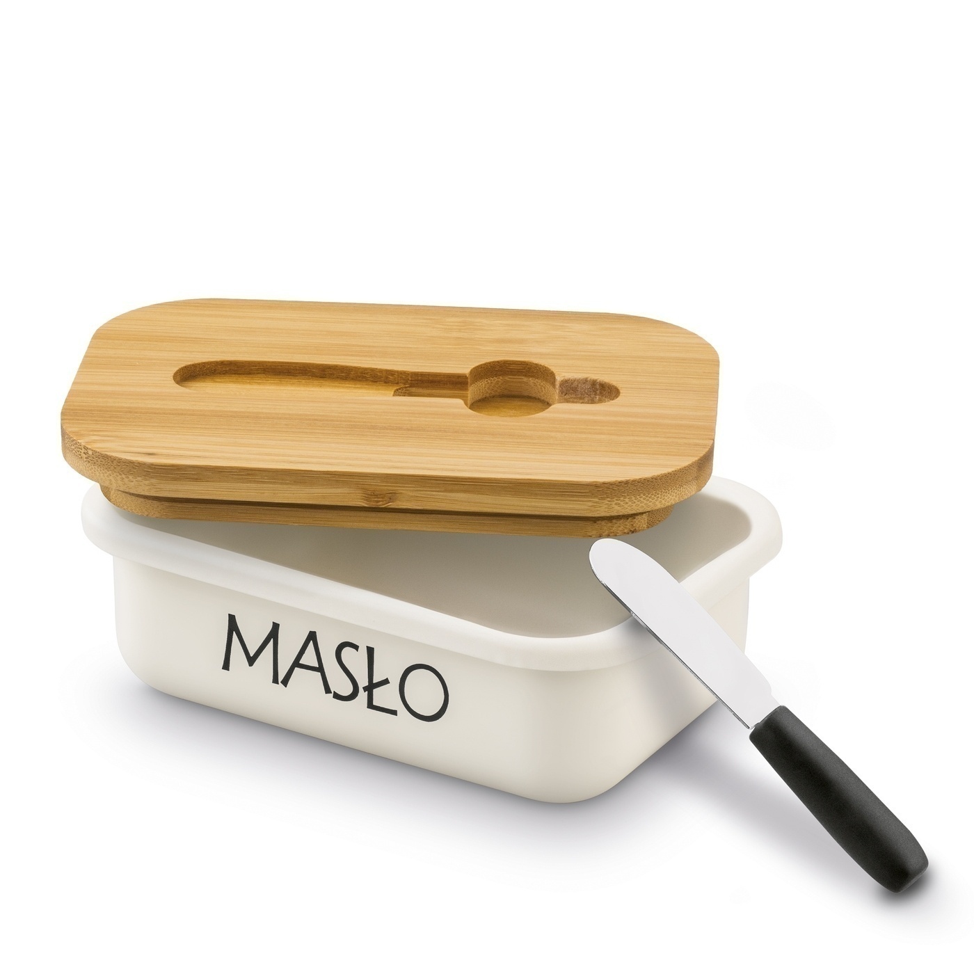 - maselnica stalowa, malowana proszkowo - pokrywa bambusowa - nożyk stalowy z czarną bakelitową rączką - wymiary maselnicy bez pokrywki: 15,5 x 10,5 x 5 cm - wymiary nożyka: 10,5 x 2 cm |