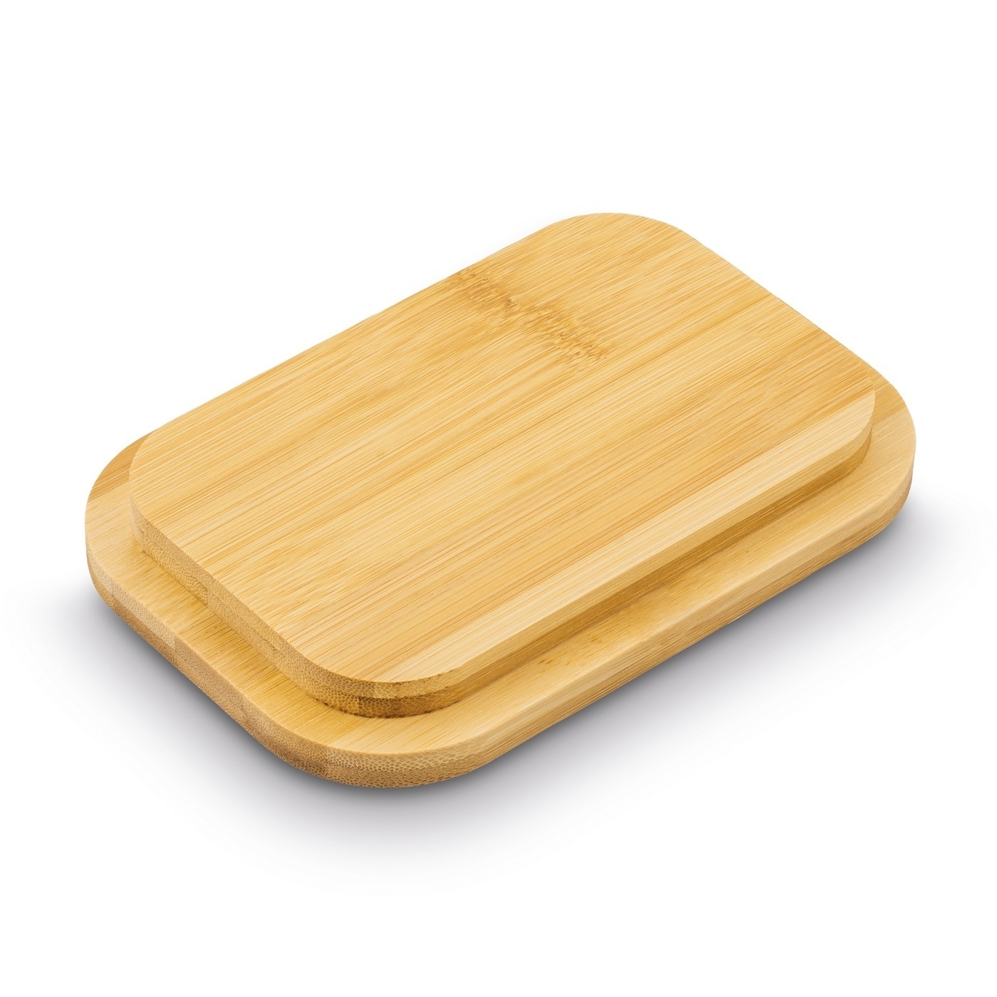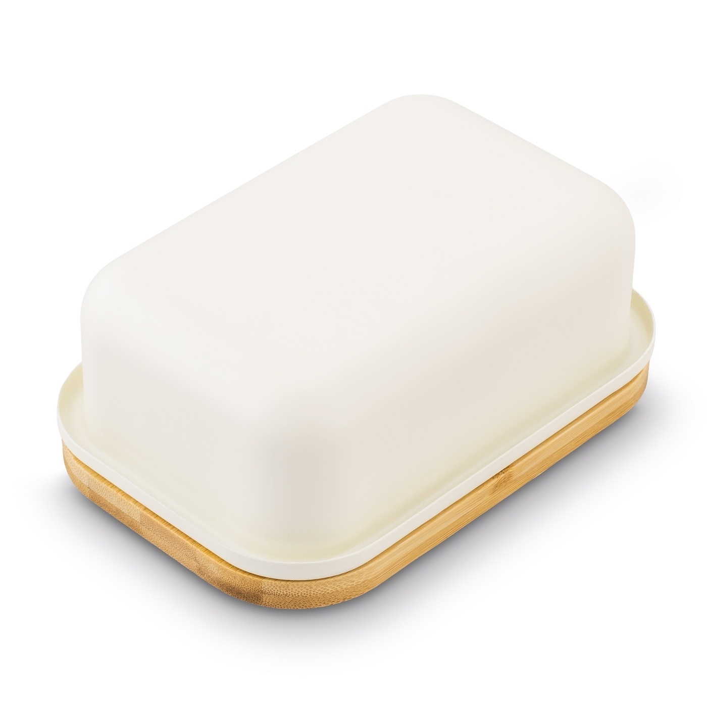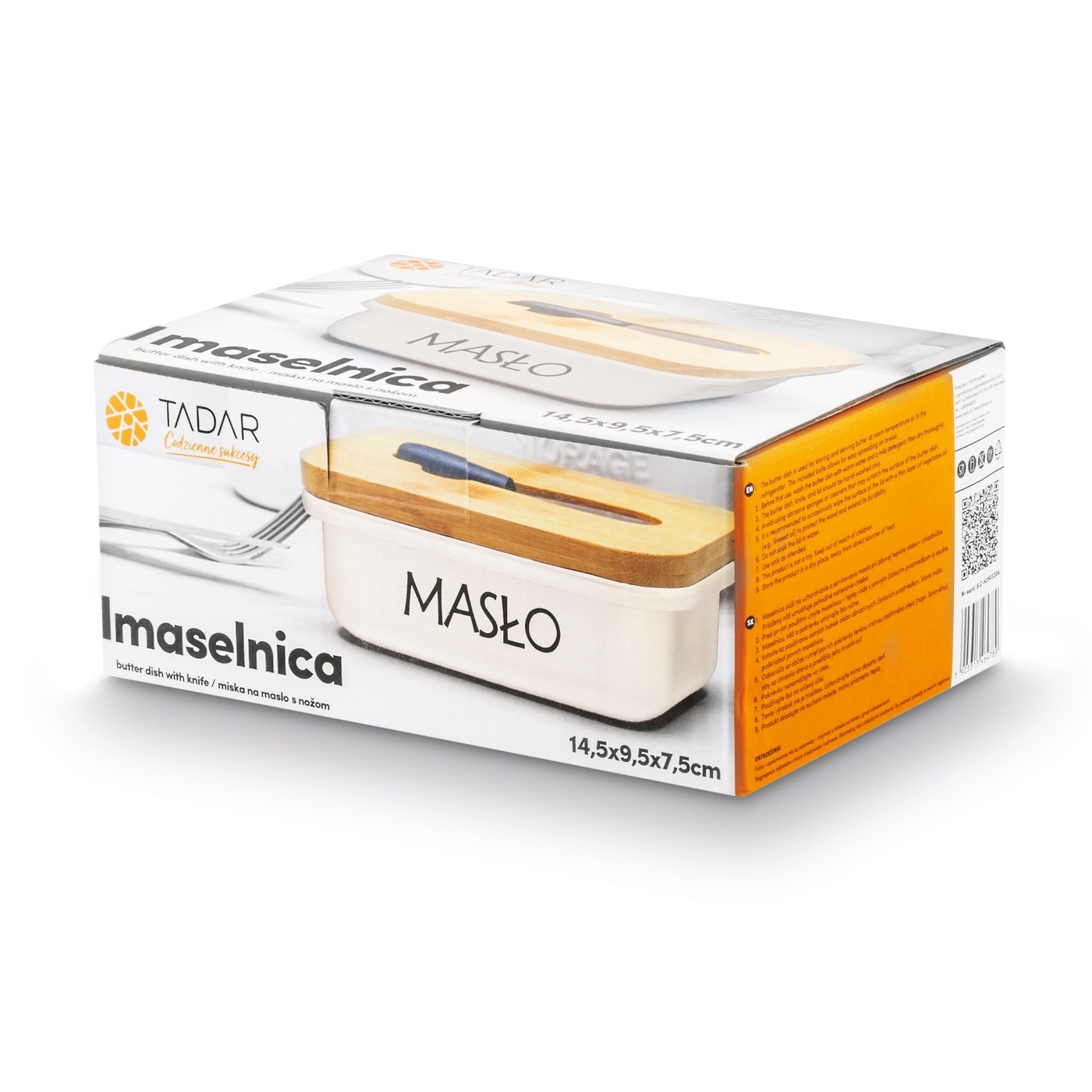 Produkt został wykonany ze stali malowanej proszkowo na jasny kolor. Jej elegancja uzupełnia prestiżowy wygląd całego projektu. W komplecie z maselniczką Tadar 15,5 x 10,5 x 6,5 cm znajduje się również pokrywka z drewna bambusowego.