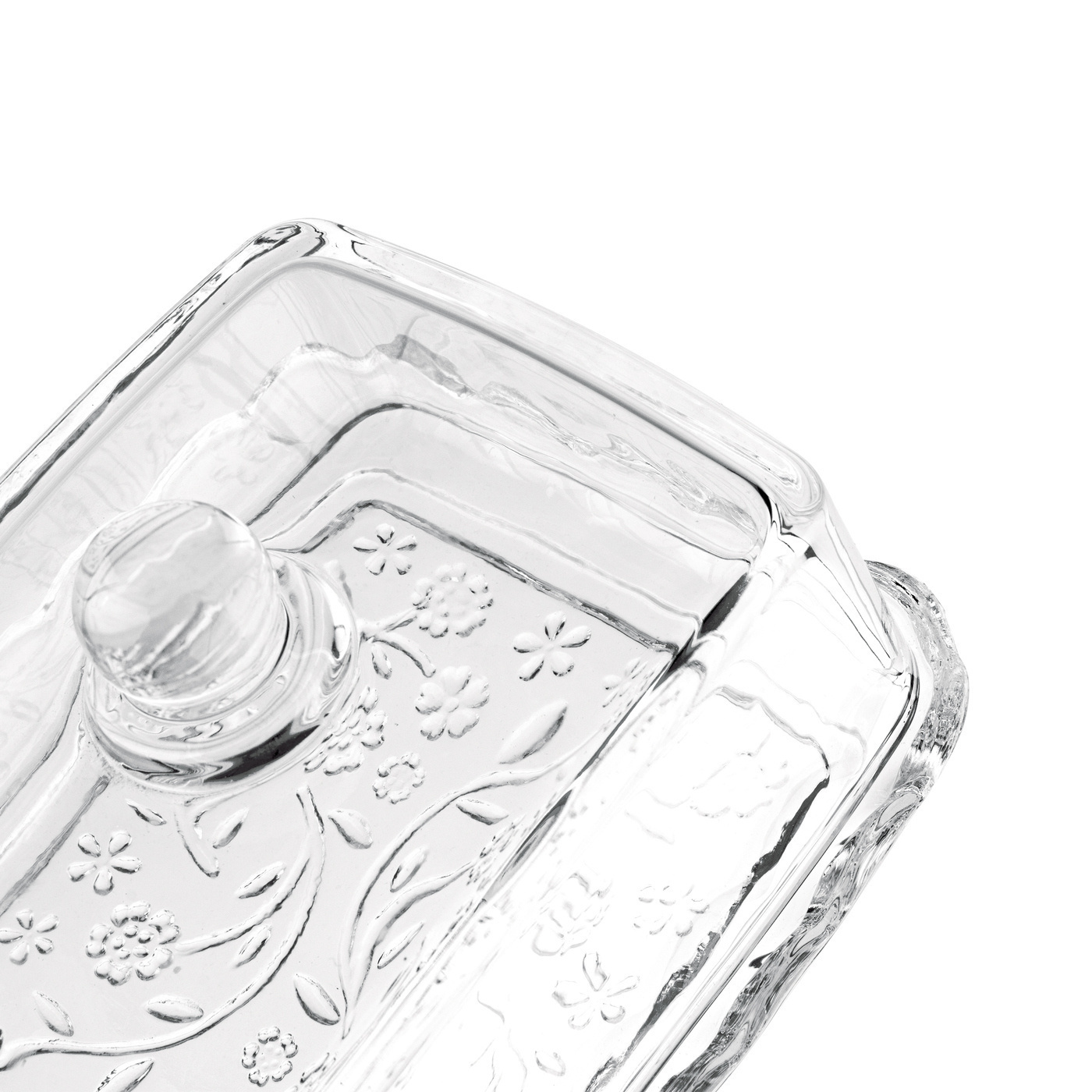 Prezentowana maselnica jest szklana. Pomieści nie tylko kostkę masła, ale też można wykorzystać ją do zabezpieczenia twarogu. W takim wypadku świetnie sprawdzi się jako element serwisu śniadaniowego.