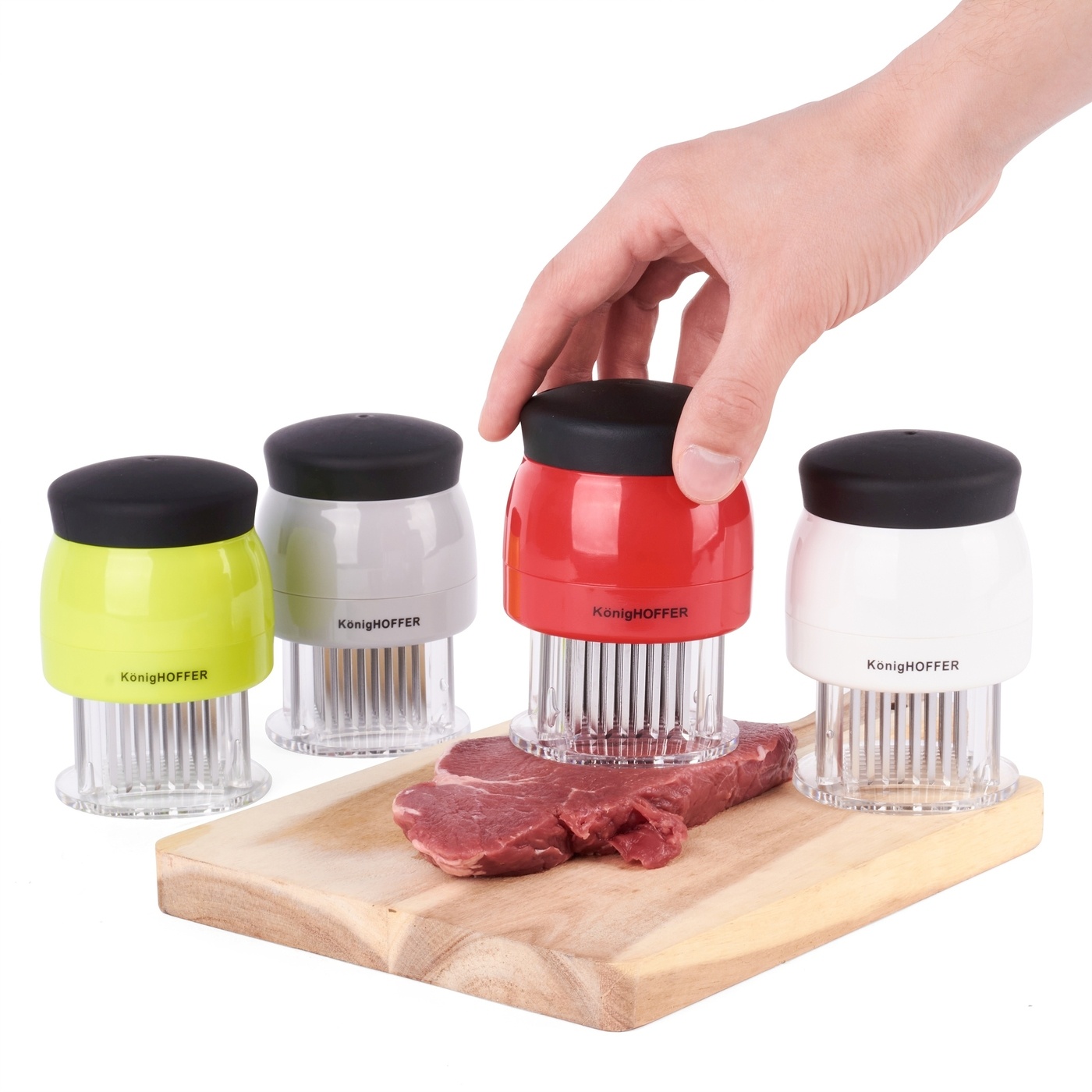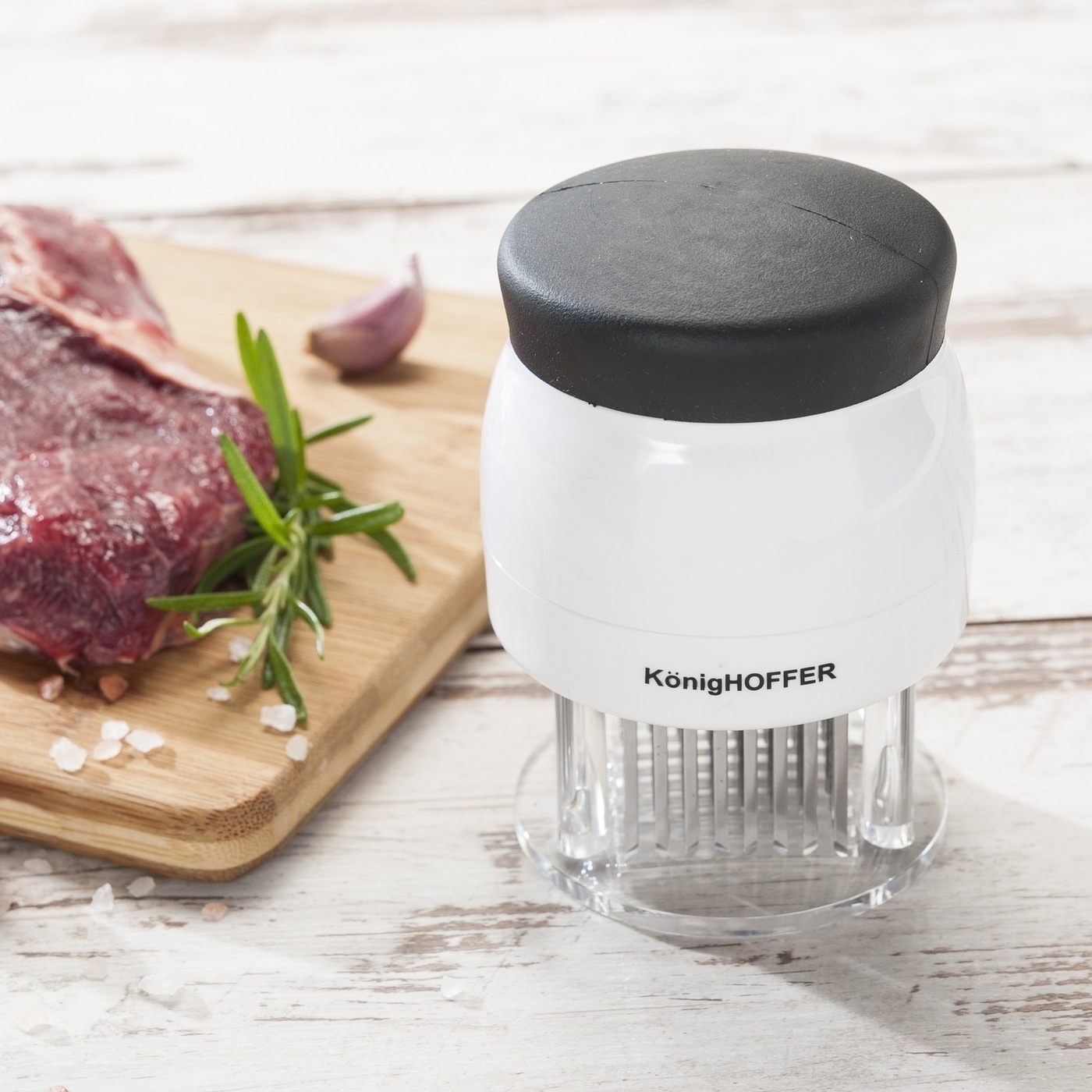 Jedną z marek akcesoriów kuchennych, które oferujemy ci w naszym sklepie internetowym, jest KönigHOFFER. Producent ten dba o to, aby jego produkty były nie tylko nowocześnie zaprojektowane, ale i posiadały odpowiednią jakość, niezawodność oraz funkcjonalność. Nakłuwacz do mięsa (biały model Jack) to jedna z opcji wyboru, które każdy entuzjasta gotowanie znajdzie w jego asortymencie. Ma on tylko jeden cel, a mianowicie uczynić mięso bardziej kruchym, delikatnymi i jednocześnie soczystym i pysznym.