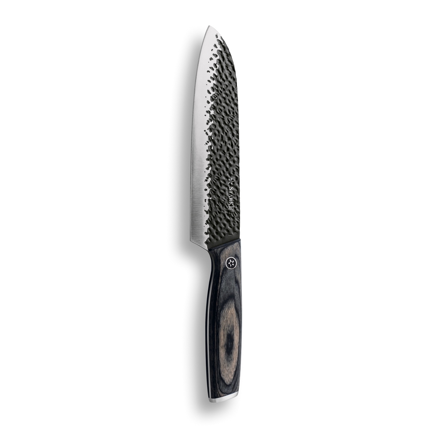 Do wykonania ostrza prestiżowego noża Santoku Hitoshi użyto stali nierdzewnej o NIEZWYKŁEJ TWARDOŚCI (chromo-molibdenowo-wanadowej X50CrMoV15). Równie łatwo ją naostrzyć, co ciąć nią nawet najtwardsze składniki.