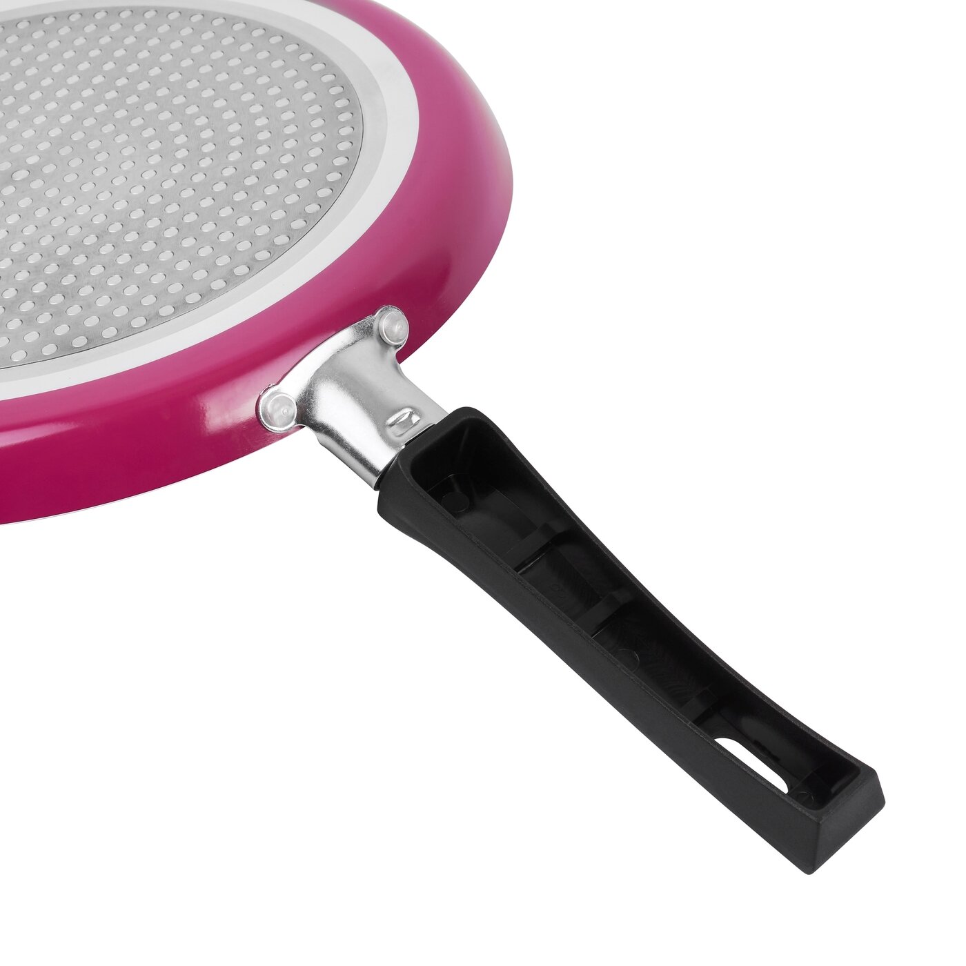 Aluminium, z którego powstała ta praktyczna patelnia, jest nie tylko trwałe i odporne, ale też lekkie. Naczynie wewnątrz pokryto czarną powierzchnią nieprzywierającą non-stick. Oznacza to, że nie uszkodzisz naleśników, bo nie musisz ich odrywać od patelni. Taka powierzchnia to także łatwe mycie (możliwość mycia w zmywarce, zalecane mycie ręczne).