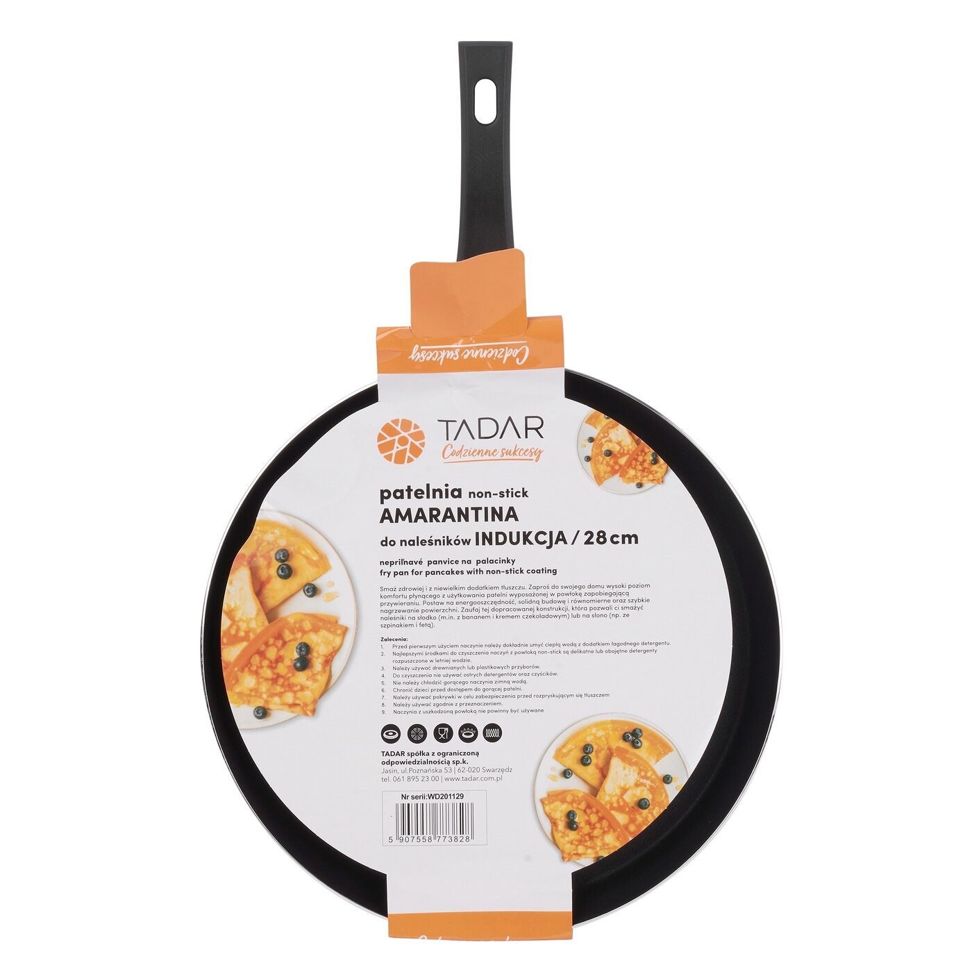 Patelnia Tadar Amarantina to wymarzone uzupełnienie kuchennego wyposażenia dla wielbicieli naleśników i tortilli. Ma ona średnicę 24 cm i pozwoli na szybkie oraz wygodne przygotowanie dużych ilości tego rodzaju dań. To niewątpliwie zasługa niskiego brzegu (2 cm), który ułatwia przewracanie naleśników bez użycia łopatki. Przyczynia się też do tego profilowany uchwyt przymocowany pod odpowiednim kątem. Wykonany jest z nienagrzewającego się tworzywa.