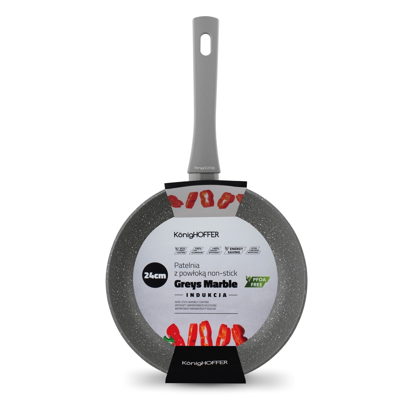 Z nią w kuchni solidnie zadbasz o apetyt bliskich! Jej trwały korpus wykuty w wysokiej temperaturze z aluminium (technika forged!) charakteryzuje bardzo dobre wyważenie. Na patelni z kolekcji Greys Marble możesz pracować w wysokiej temperaturze. Zrobisz to bez obaw, gdyż model ma oznaczenie PFOA Free. Uniwersalna wysokość brzegu patelni pozwoli ci wygodnie mieszać składniki.