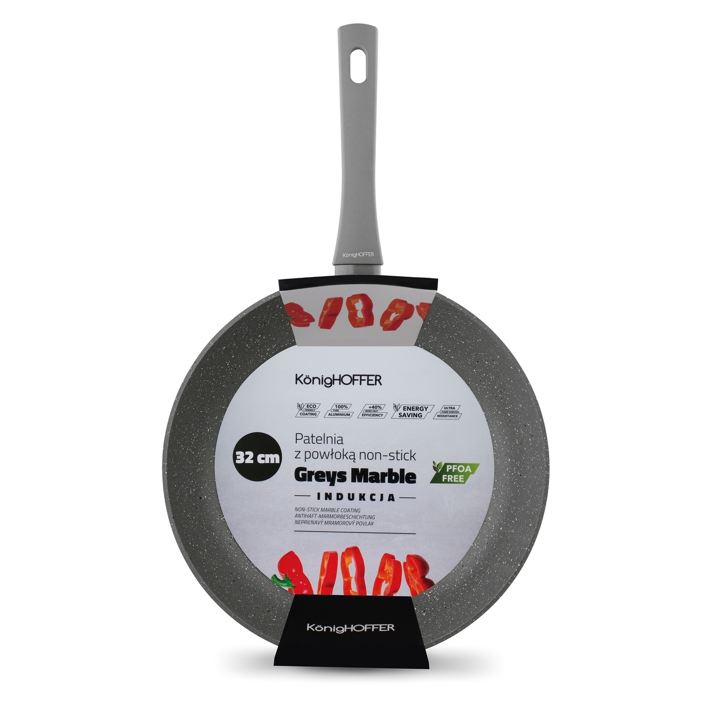 Z nią w kuchni solidnie zadbasz o apetyt bliskich! Jej trwały korpus wykuty w wysokiej temperaturze z aluminium (technika forged!) charakteryzuje bardzo dobre wyważenie. Na patelni z kolekcji Greys Marble możesz pracować w wysokiej temperaturze. Zrobisz to bez obaw, gdyż model ma oznaczenie PFOA Free. Uniwersalna wysokość brzegu patelni pozwoli ci wygodnie mieszać składniki.