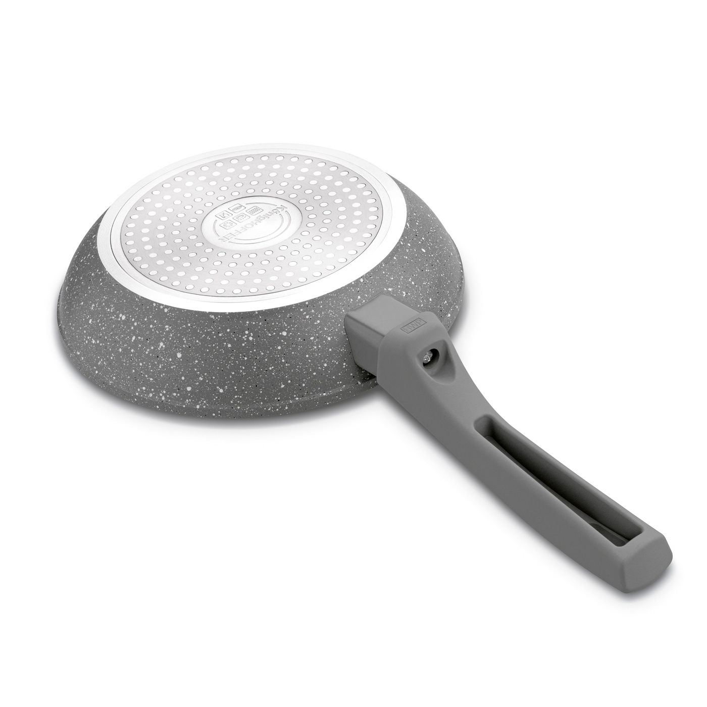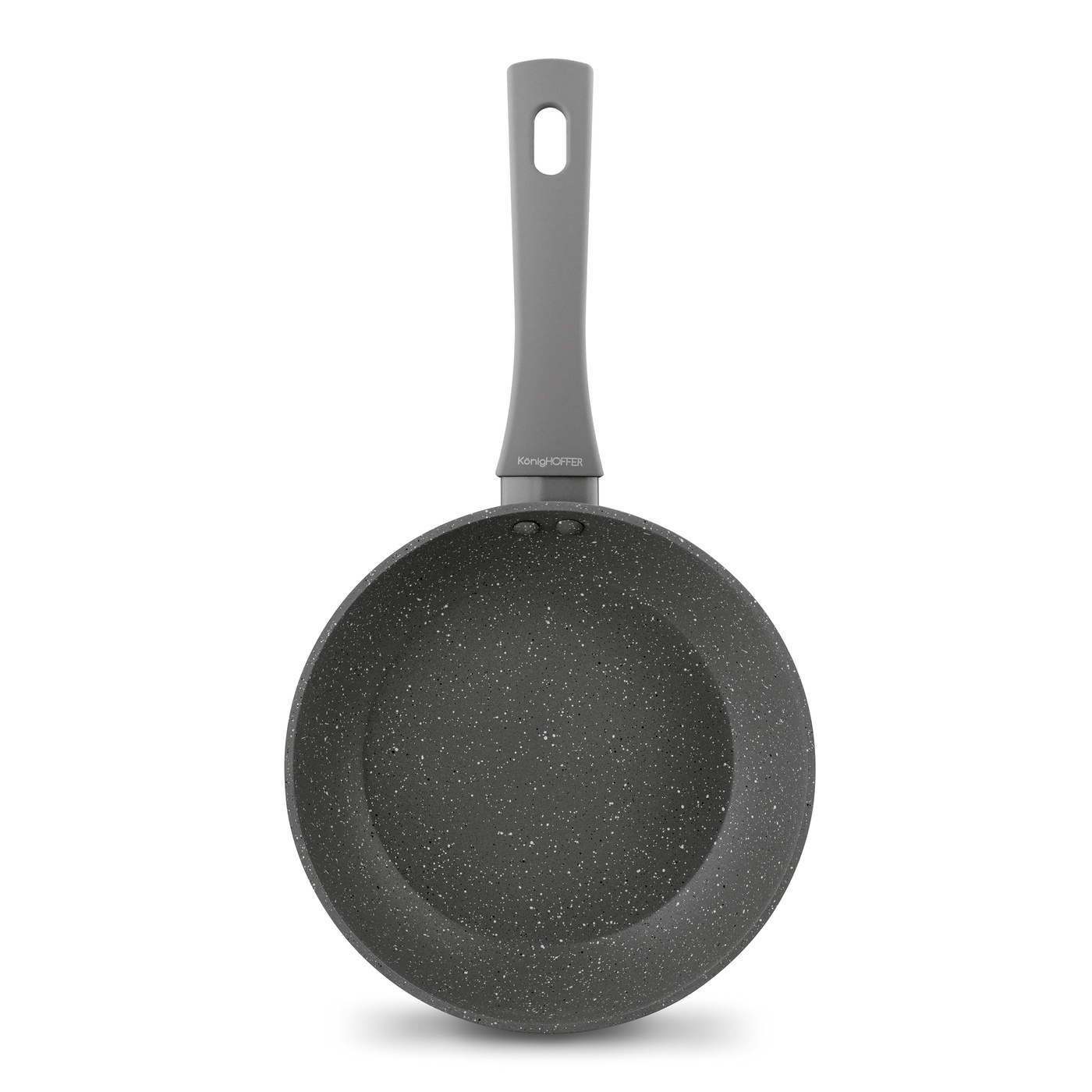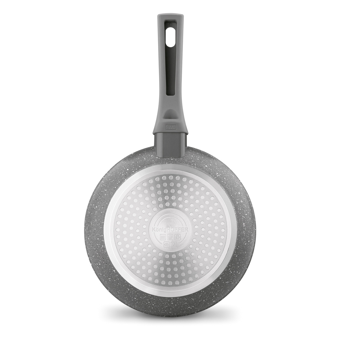 Dno patelni jest przystosowane do pracy na wszystkich typach kuchenek: indukcyjnych, gazowych, elektrycznych oraz ceramicznych. Dzięki temu naczynie pozostaje uniwersalne i wygodne w codziennym użytkowaniu. Szary, nakrapiany design inspirowany marmurem dobrze komponuje się z nowoczesną aranżacją kuchni.