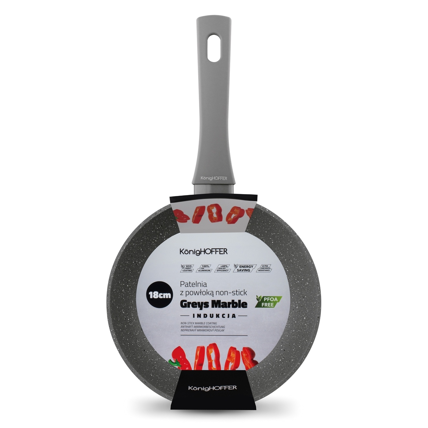 Patelnia Konighoffer Greys Marble 18 cm to praktyczne rozwiązanie do codziennego smażenia niewielkich porcji. Jej kompaktowy rozmiar sprawdzi się podczas przygotowywania śniadań, jajek sadzonych, warzyw lub pojedynczych porcji mięsa. To dobry wybór do mniejszej kuchni, aneksu lub jako uzupełnienie większego zestawu patelni.