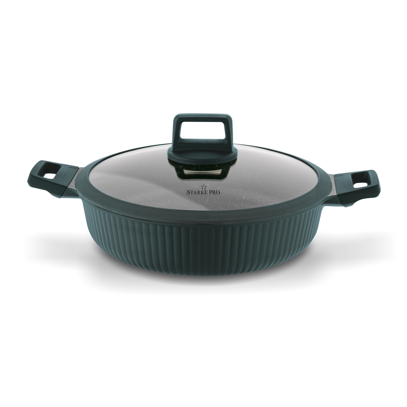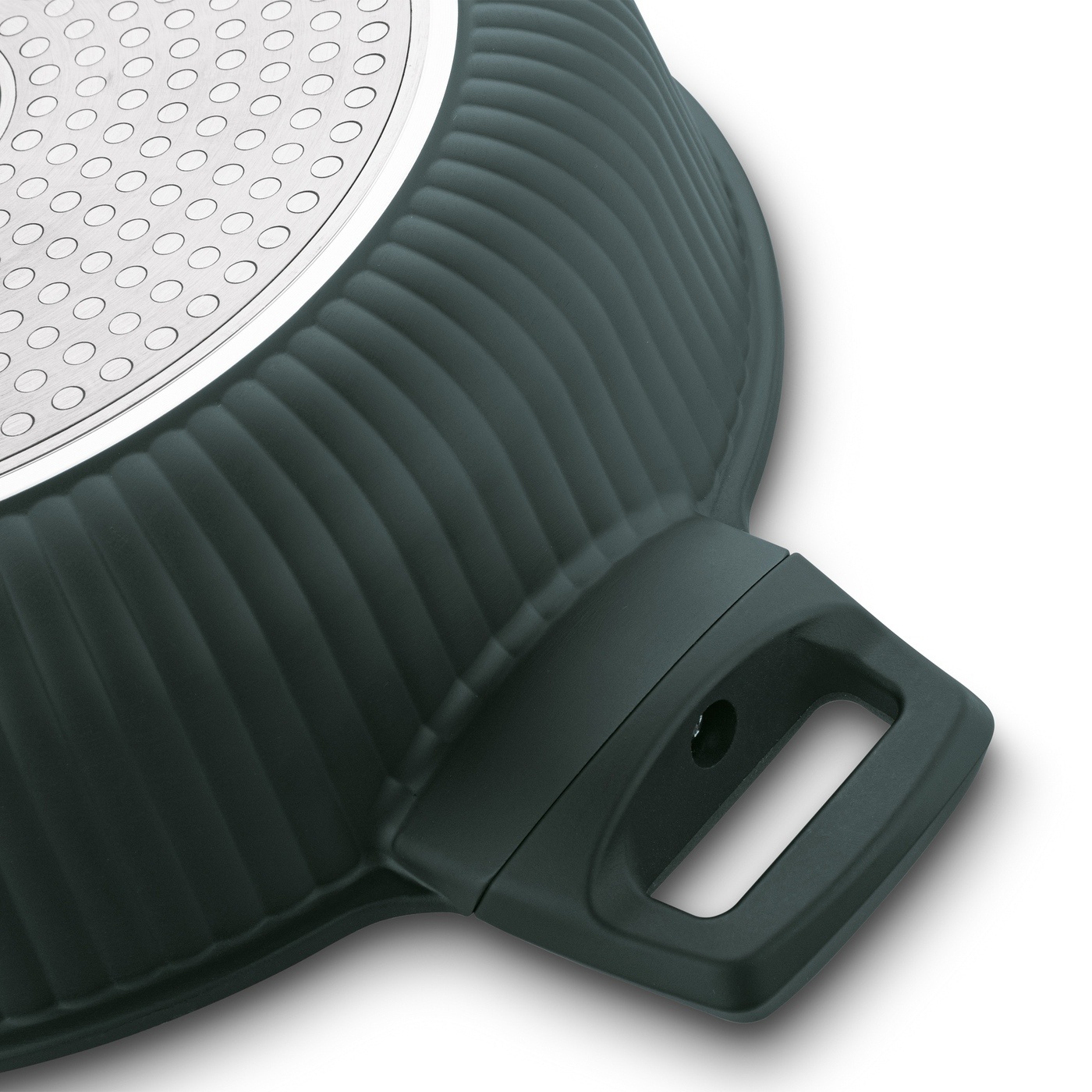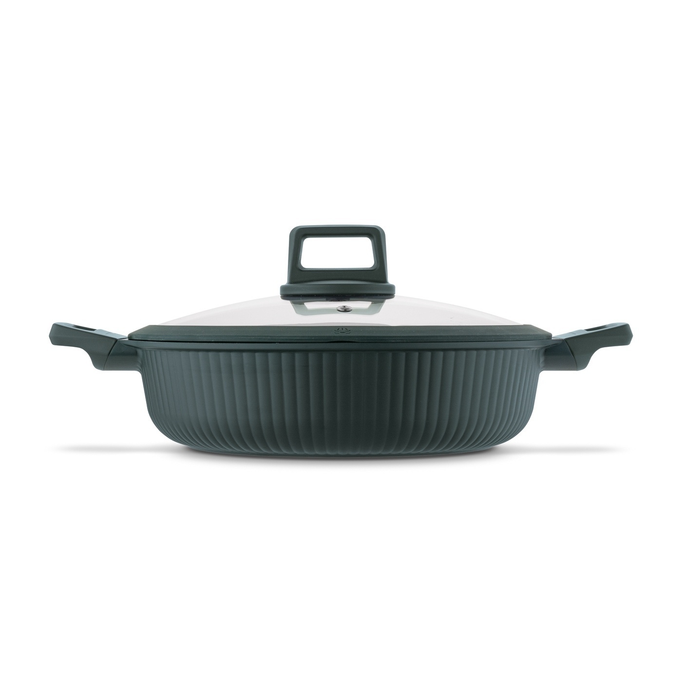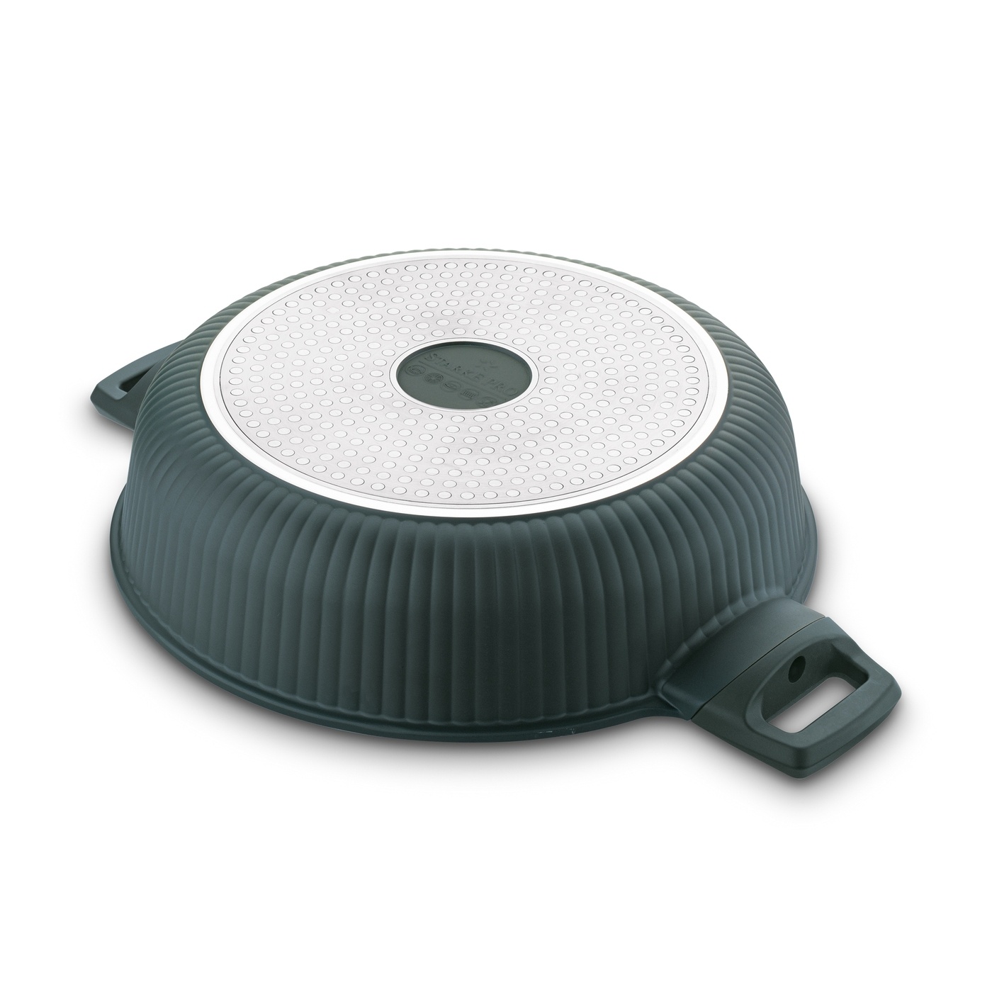 Patelnia ma kształt płytkiego garnka oraz pokrywkę w zestawie. Jej korpus jest bardzo dobrze wyważony i solidny. Wykonano go z aluminium odlanego techniką die cast. Jest dzięki temu cięższy niż klasyczne patelnie aluminiowe i doskonale przewodzi ciepło. Z zewnątrz projekt urozmaicono tłoczeniem. Model patelni nadaje się więc do smażenia i użytkowania w wysokich temperaturach oraz kilkugodzinnego duszenia posiłków.