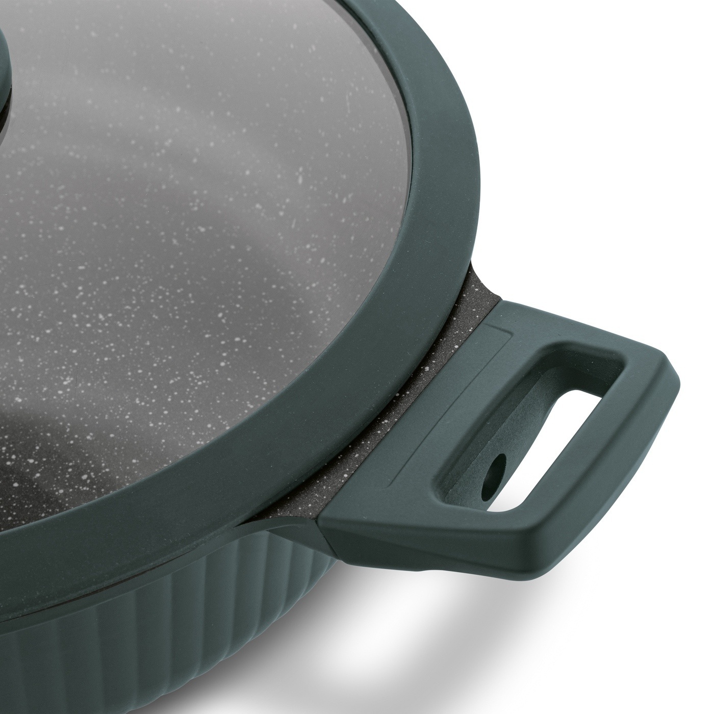 - korpus aluminiowy, odlewany - powłoka non stick Marble Plus o lekko chropowatej teksturze - powłoka trzywarstwowa - 10000 cykli ścierania - PFOA free - grubość dna: 4 mm - grubość ścianki: 1,8 mm - grubość brzegu: 5 mm - pokrywa szklana z silikonowym rantem - uchwyty wykonane z tworzywa sztucznego typu soft touch, przykręcane |