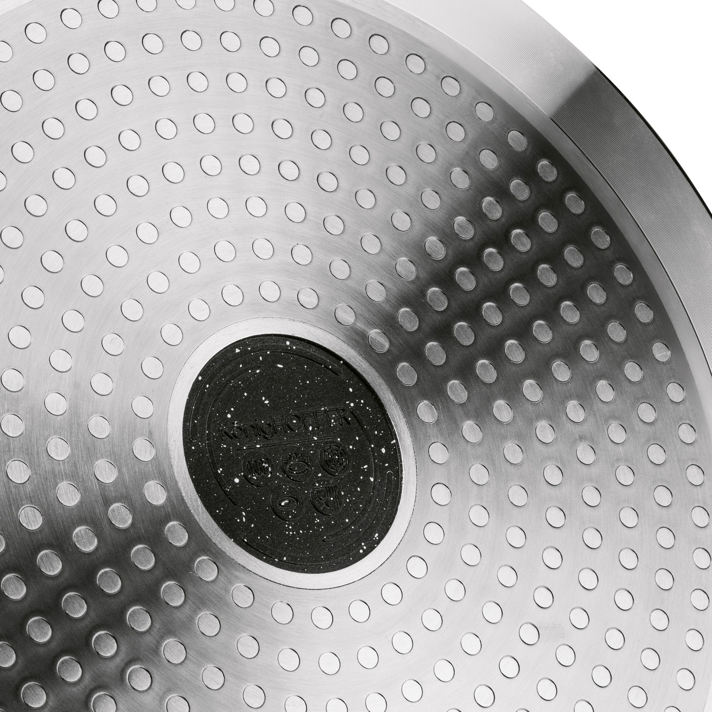 W komplecie znajdziesz także dedykowaną pokrywkę ze stalowym uchwytem. Dzięki niej możesz dusić potrawy i lepiej regulować ilość pary wodnej wewnątrz. Użyta powłoka zapobiegająca przywieraniu i przypaleniu składników sprawia, że możesz podsmażać jedzenie. Potrzebujesz do tego tylko odrobinę masła lub oliwy.