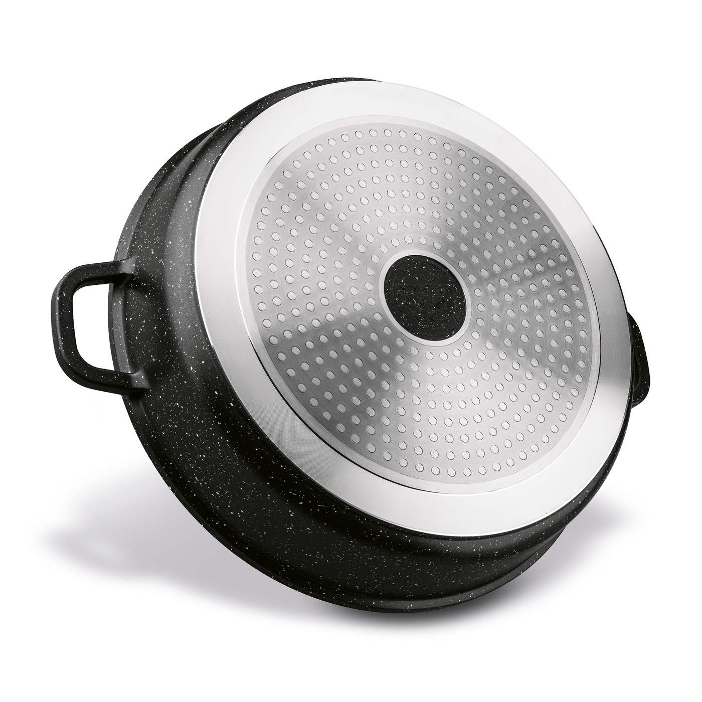 - patelnia aluminiowa, odlewana z powłoką non stick Marble Plus - 10000 cykli ścierania - pokrywa szklana ze stalowym rantem i odpowietrznikiem - uchwyty patelni odlewane - uchwyt pokrywy stalowy, przykręcany - wysokość patelni bez pokrywy: 8 cm - patelnię bez pokrywy można używać w piekarniku, maksymalna temperatura użytkowania: 200 st. C - nie można nagrzewać pustego naczynia- grozi uszkodzeniem powłoki - w czasie użytkowania używać ochronnych rękawic kuchennych |