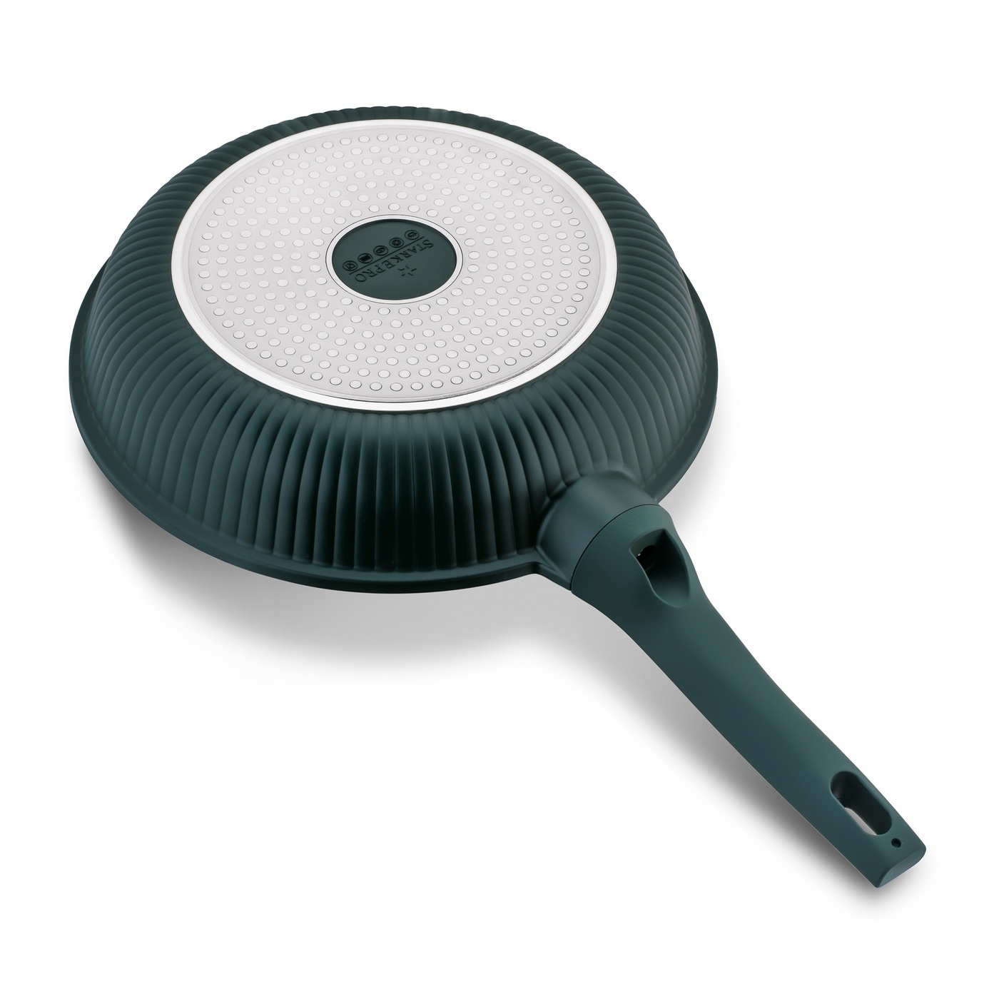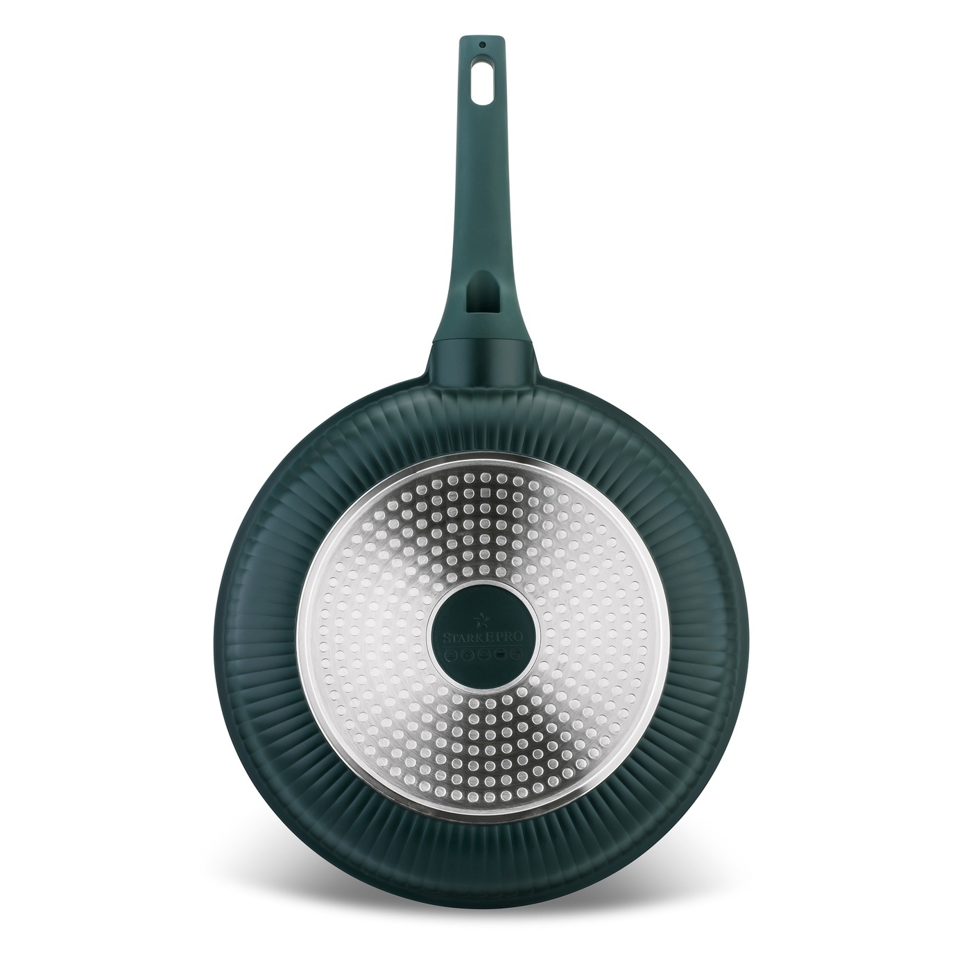 Wnętrze naczynia pokryto natomiast trzywarstwową, marmurową powłoką nieprzywierającą. Jest to wysokiej jakości powierzchnia MARBLE PLUS. Charakteryzuje się świetną przyczepnością, dużą twardością i dobrym zabezpieczeniem przed przypadkowym zarysowaniem. Co więcej, wytrzyma 10 000 cykli ścierania (standard na rynku patelni non-stick to zaledwie 2000).