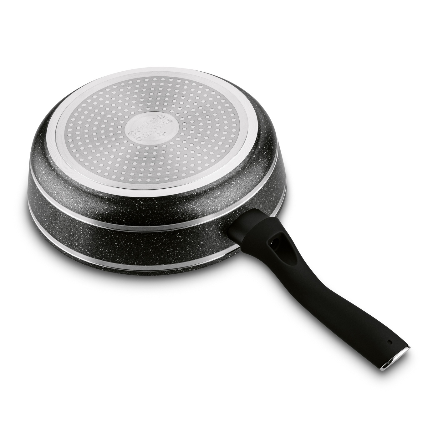 - patelnia aluminiowa pokryta powłoką Marble Plus o wysokiej przyczepności i doskonałej odporności na ścieranie i zarysowania - powłoka trzywarstwowa - 10 000 cykli ścierania - PFOA free - grubość dna: 3,5 mm - grubość ścianki: 2,7 - grubość brzegu: 4,2 mm - antypoślizgowe uchwyty z tworzywa sztucznego typu soft touch - uchwyt pokrywy przykręcany - uchwyt patelni nitowany, część z tworzywa sztucznego przykręcana - pokrywa szklana ze stalowym rantem i odpowietrznikiem |