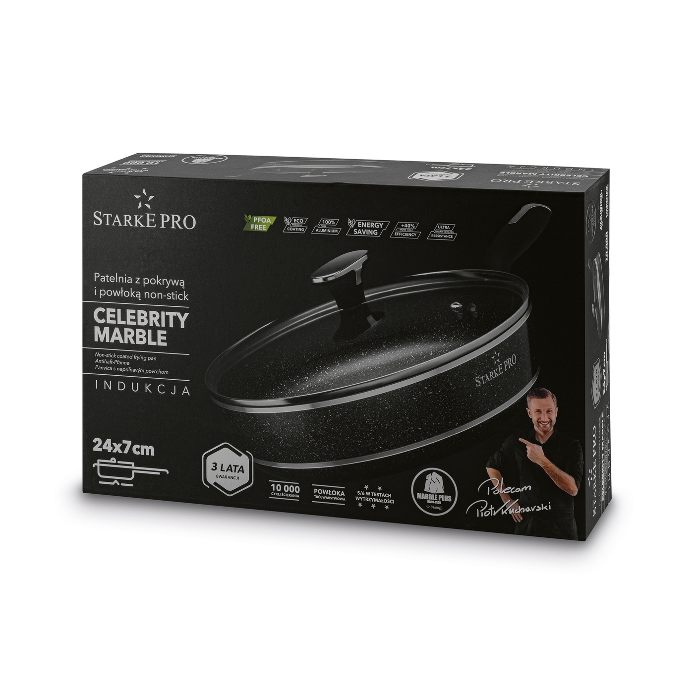 To produkt, który zasługuje na najwyższą ocenę, ponieważ nie tylko działa na każdej kuchence, w tym na indukcji, ale również poleca go zawodowy szef kuchni, Piotr Kucharski, ambasador marki Starke Pro. Marmurowa patelnia Celebrity otrzymała 5/6 gwiazdek w testach wytrzymałości. Model objęty jest również aż 3-letnią gwarancją producenta.