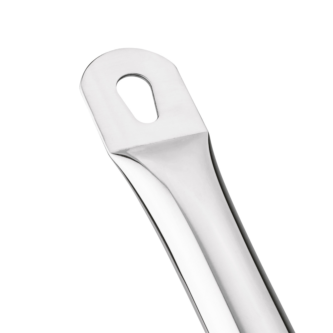 Oto model, który wytrzyma długie rozgrzewanie – godziny smażenia dla gości, każdego dnia i przez wiele sezonów. Jej kulinarny potencjał można odkryć także w domu. Z pomocą dużej, wielopunktowo mocowanej (spawanej!) rączki, która się nie nagrzewa, zyskasz komfort użytkowania, bo to naprawdę poręczna patelnia. Uchwyt ma też otwór do zawieszenia produktu podczas przechowywania.