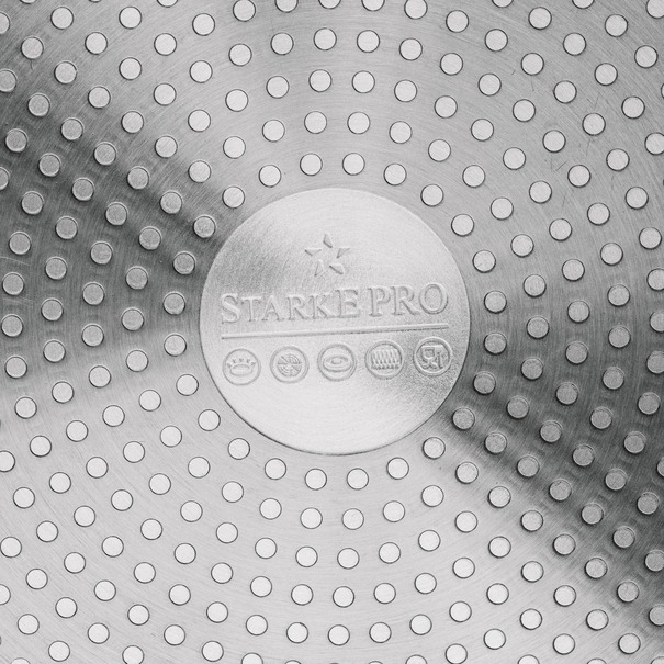 Wnętrze standardowej patelni Starke Pro Starlet Brown zostało pokryte trzywarstwową powłoką non-stick MARBLE PLUS. Jej twarda struktura jest dobrze zabezpieczona przed zarysowaniem. Ma też oznaczenie PFOA Free, co gwarantuje, iż powstała bez dodatku toksycznych substancji.